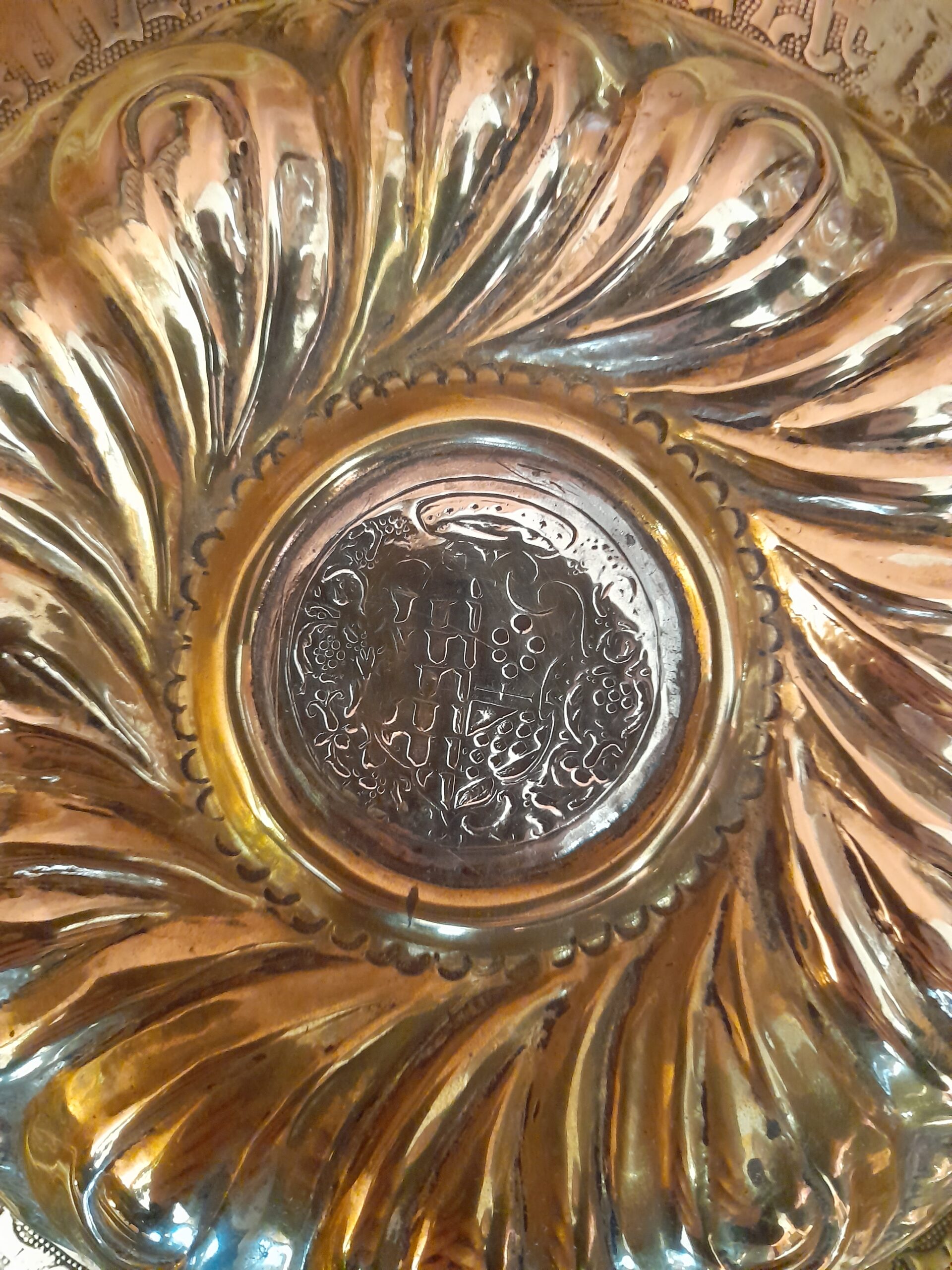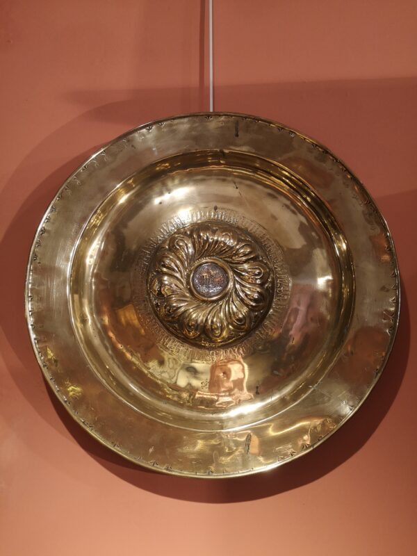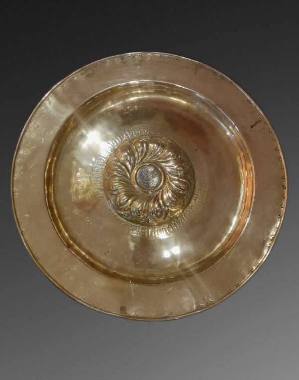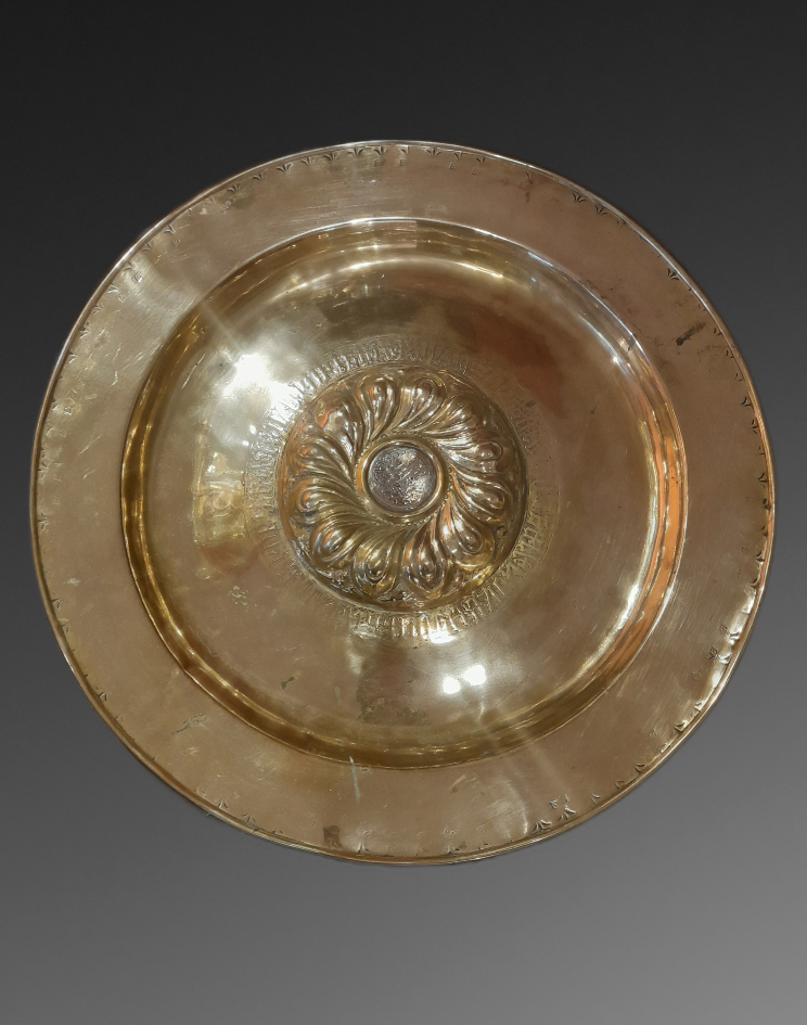 This beautiful brass offering plate is composed of an embossed umbilicus encircled by twelve pointed gadroons forming a swirling rosette that ends in a serrated motif. The outer spaces are filled with foliage. The centre of the umbilicus is defined by a silver medallion on which is chiselled a coat of arms slightly erased in places. On the central part, a German coat of arms is outlined in a mannered way and divided into three fields.The dexter field (left part from the point of view of the spectator) is composed of many small regular elements. The sinister field (right part from the point of view of the spectator) is divided into two parts. We can see, on the upper part, six round patterns in hollow. The lower part consists of a recessed background with a checkerboard pattern.