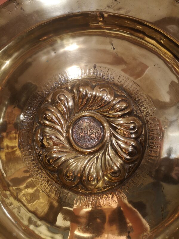 The central part is encircled on the basin by a full inscription in German, in gothic letters, not very legible, on a dotted background.