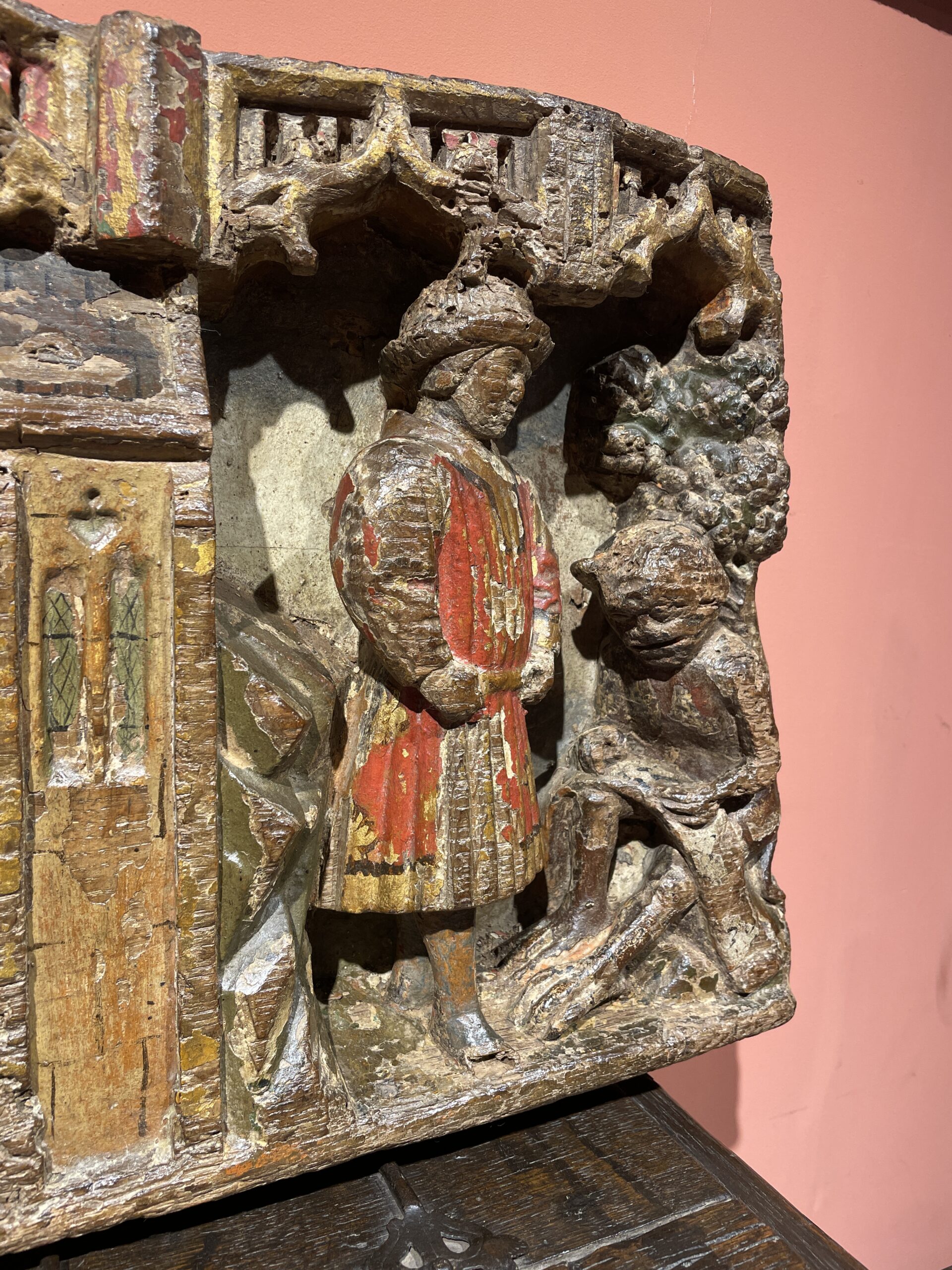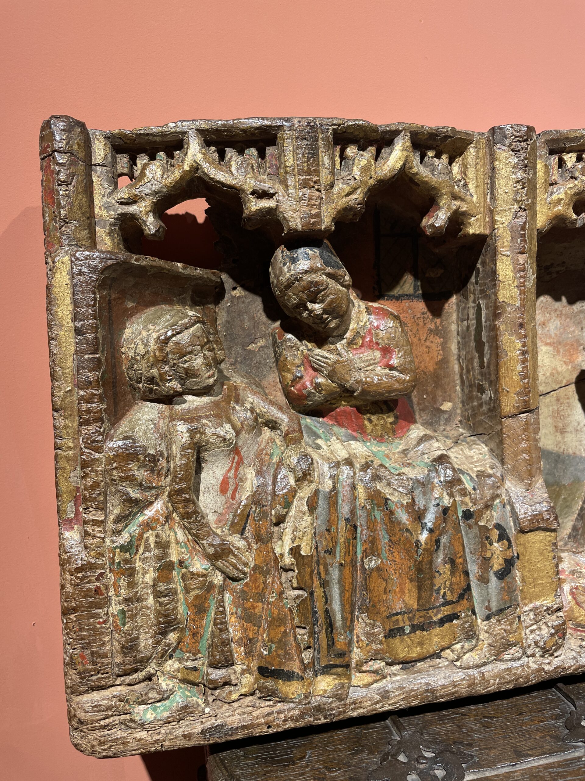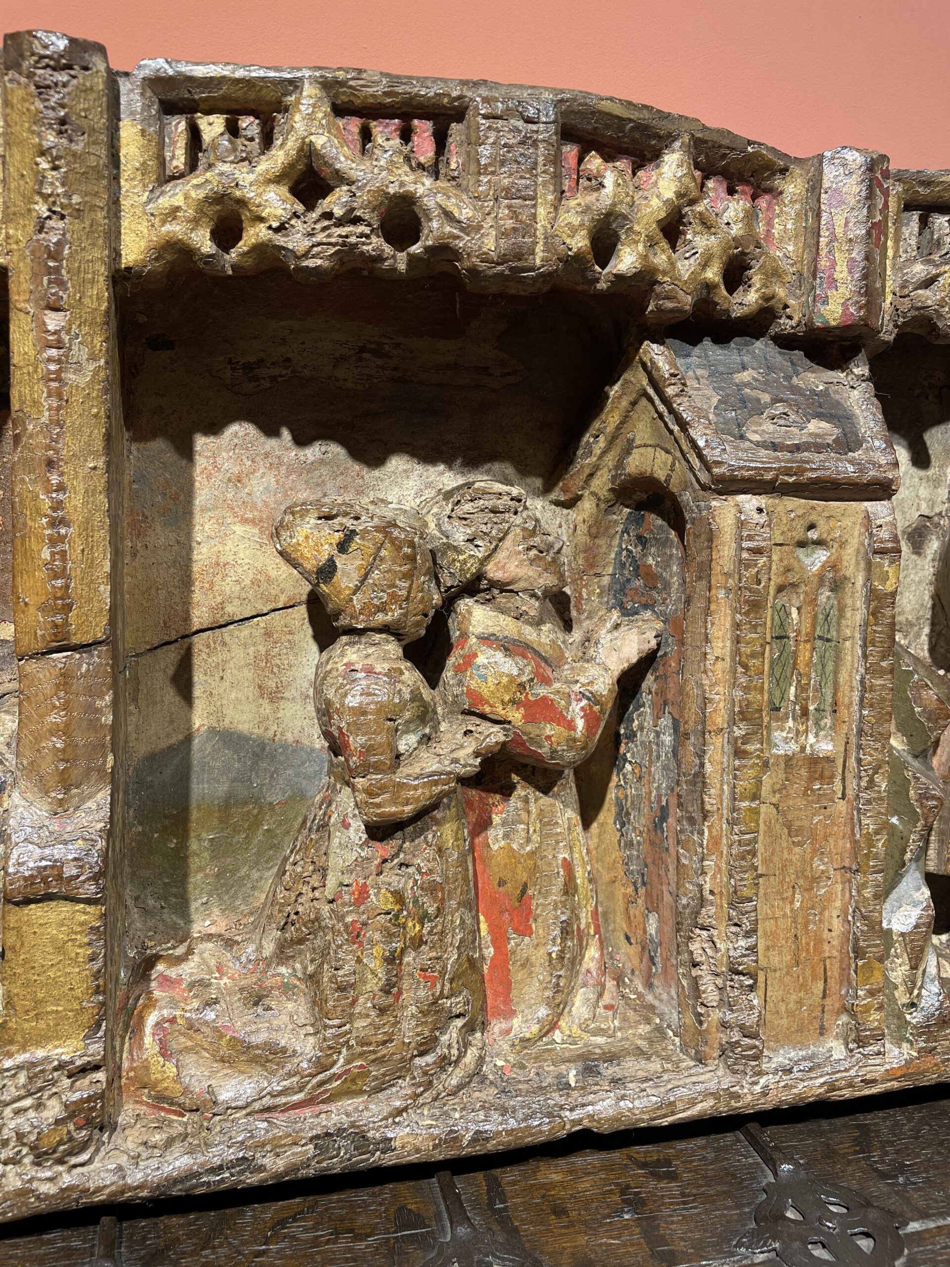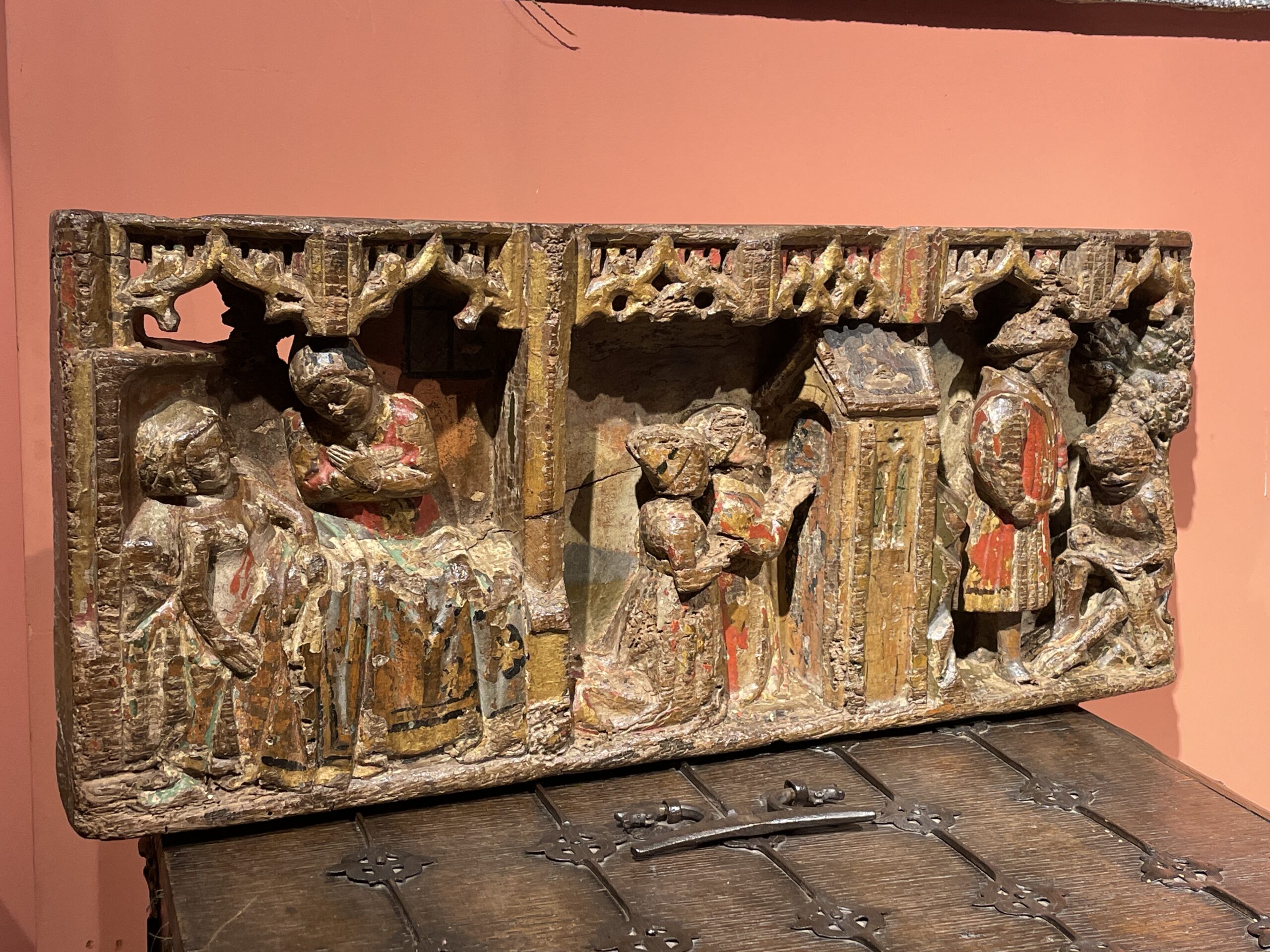 This predella in carved chestnut wood, polychromed and gilded, features three small narrative scenes set beneath a delicate openwork tracery frieze of distinctly Gothic character.