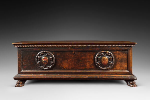 This cassone, remarkable for its sobriety, sits on two clawed lion’s feet and a moulded base.