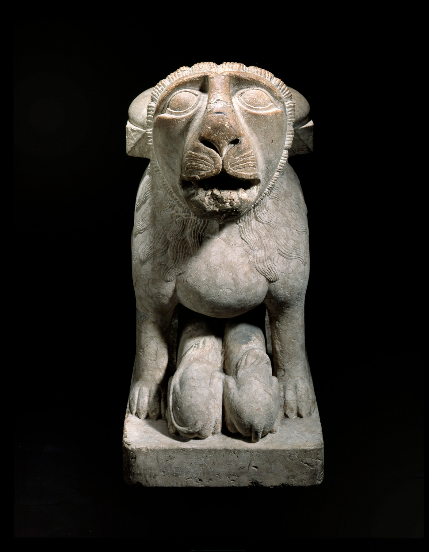 The lioness sits on her haunches ; her front legs are uprightand between them are two suckling cubs. The mother has a full mane carved with grooved curvilinear locks which extend backwardsfrom  a smooth ring circling the head.
