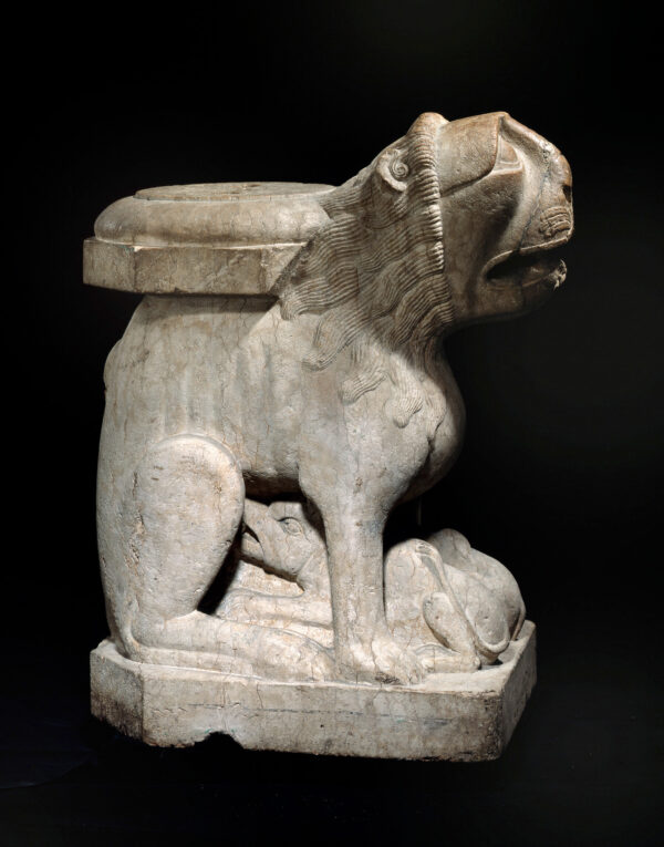 The term stylophore comes from Greek, meaning pillar support. The lion stylophores were originally entrusted by the people of the Middle Orient, the Sumerians, the Hittites, the Assyrians and also the Egyptians and the Greeks to guard their holy shrines.