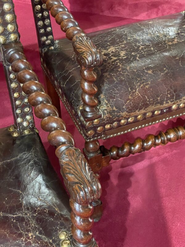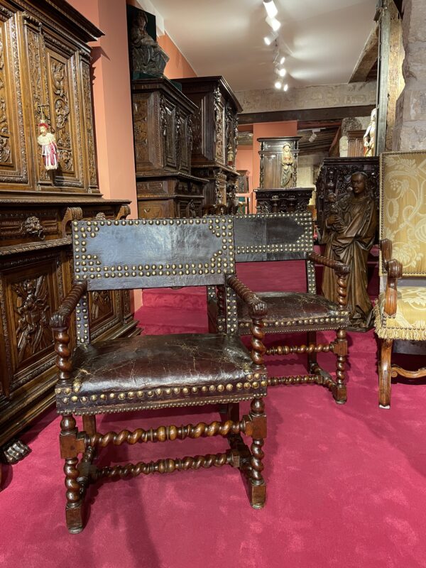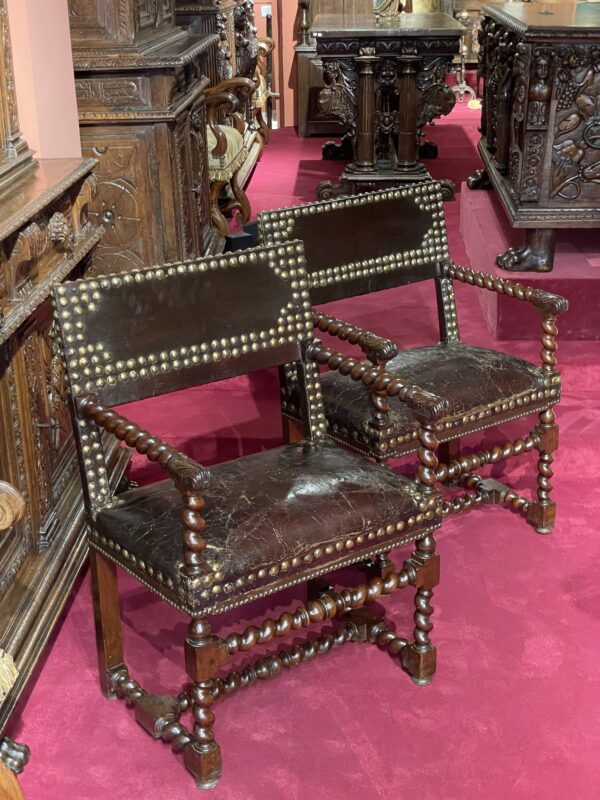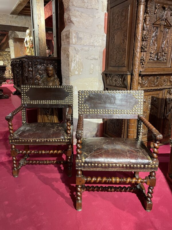 The consistent quality of the turning, along with the evident skill required to execute such intricate spirals, makes this pair of armchairs particularly noteworthy. They exemplify French craftsmanship from the late 16th to early 17th centuries.