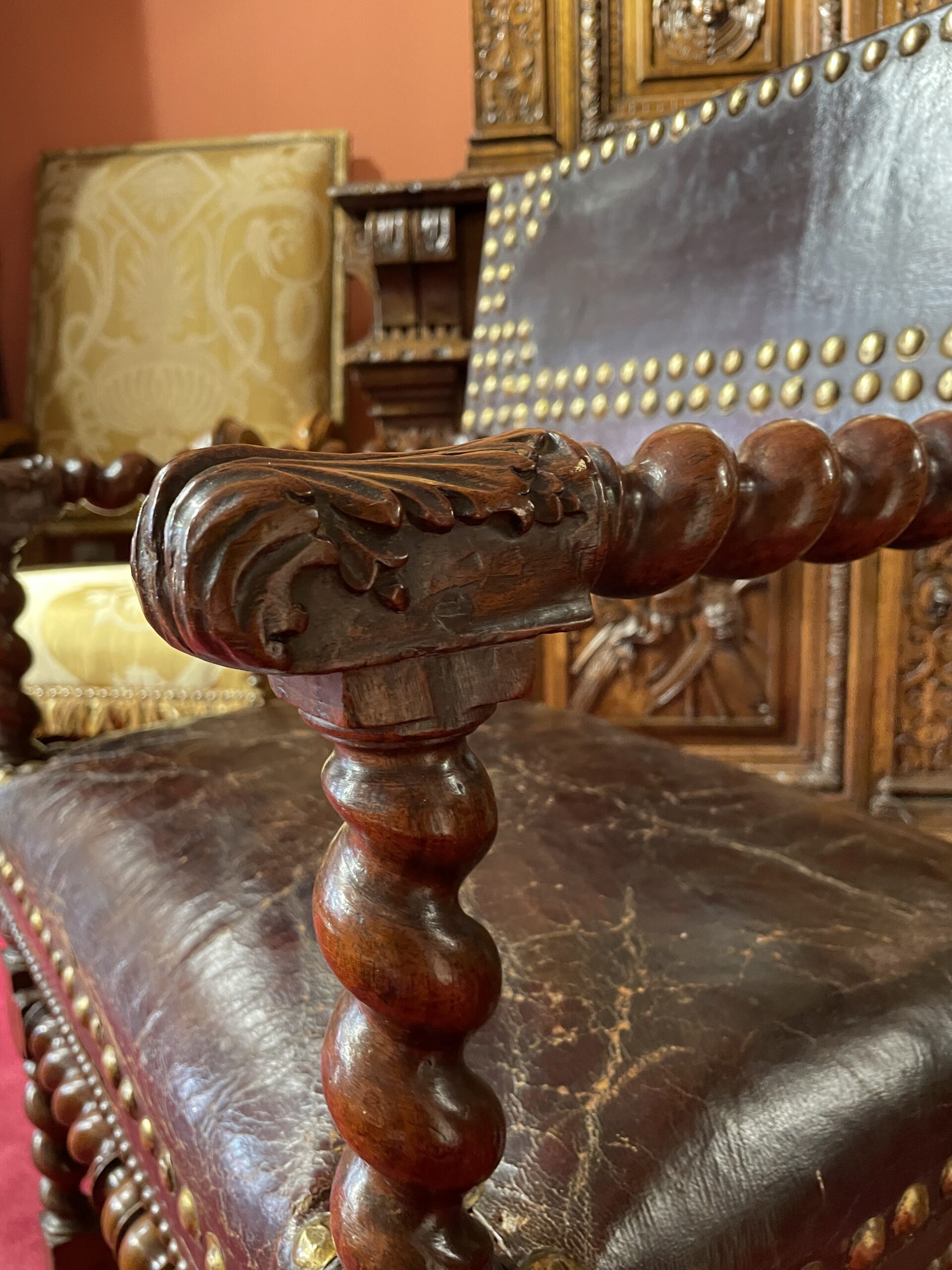 The vividly twisted armrests terminate in leafy ends adorned with finely carved acanthus motifs.