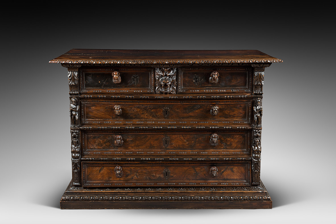 The four elongated drawers are framed with pearl friezes, each holding two beautifully made human face-like handles and a central keyhole.