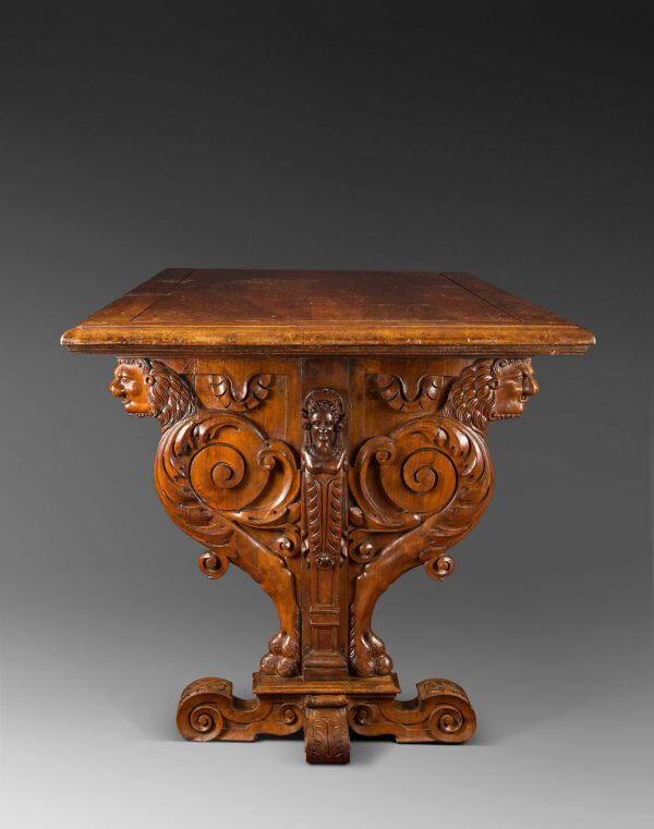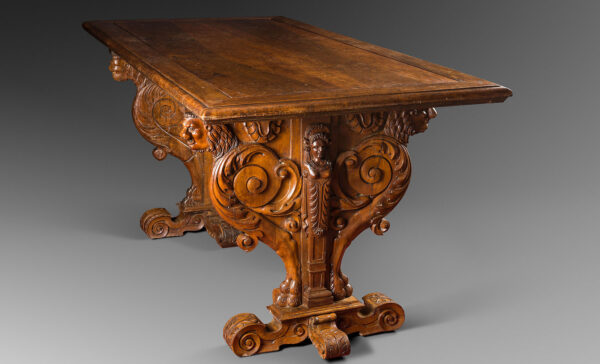 The French table transformed during the Renaissance. Inspired by Italy in its form and decorations, it was born in the crucible of the Fontainebleau School, where architects and ornamentalists, such as Jacques Androuet du Cerceau and Hugues Sambin, were trained. Both a ceremonial table and a piece of sculpture, it marks one of the peaks of the art of furniture in France (J. Thirion).