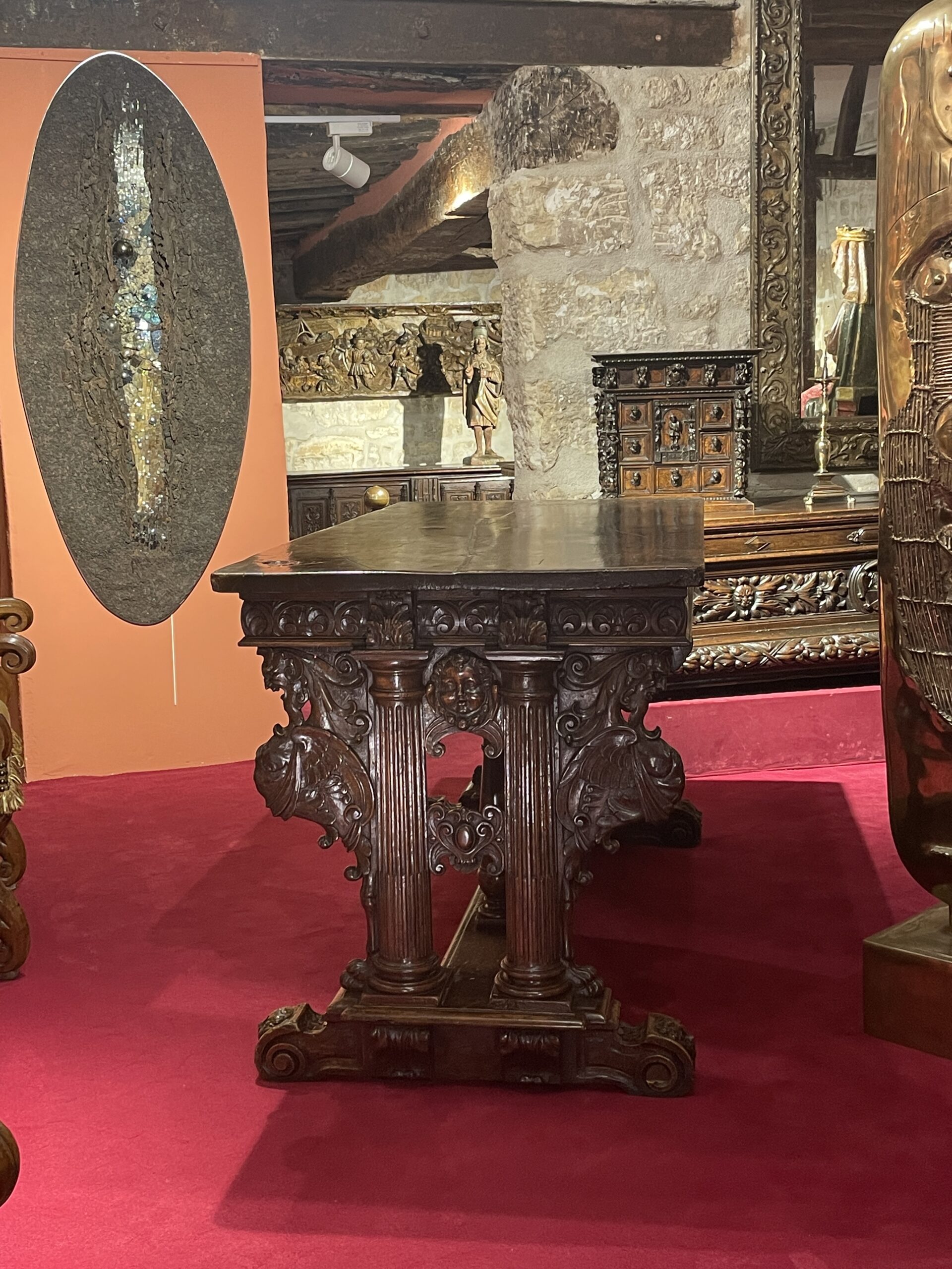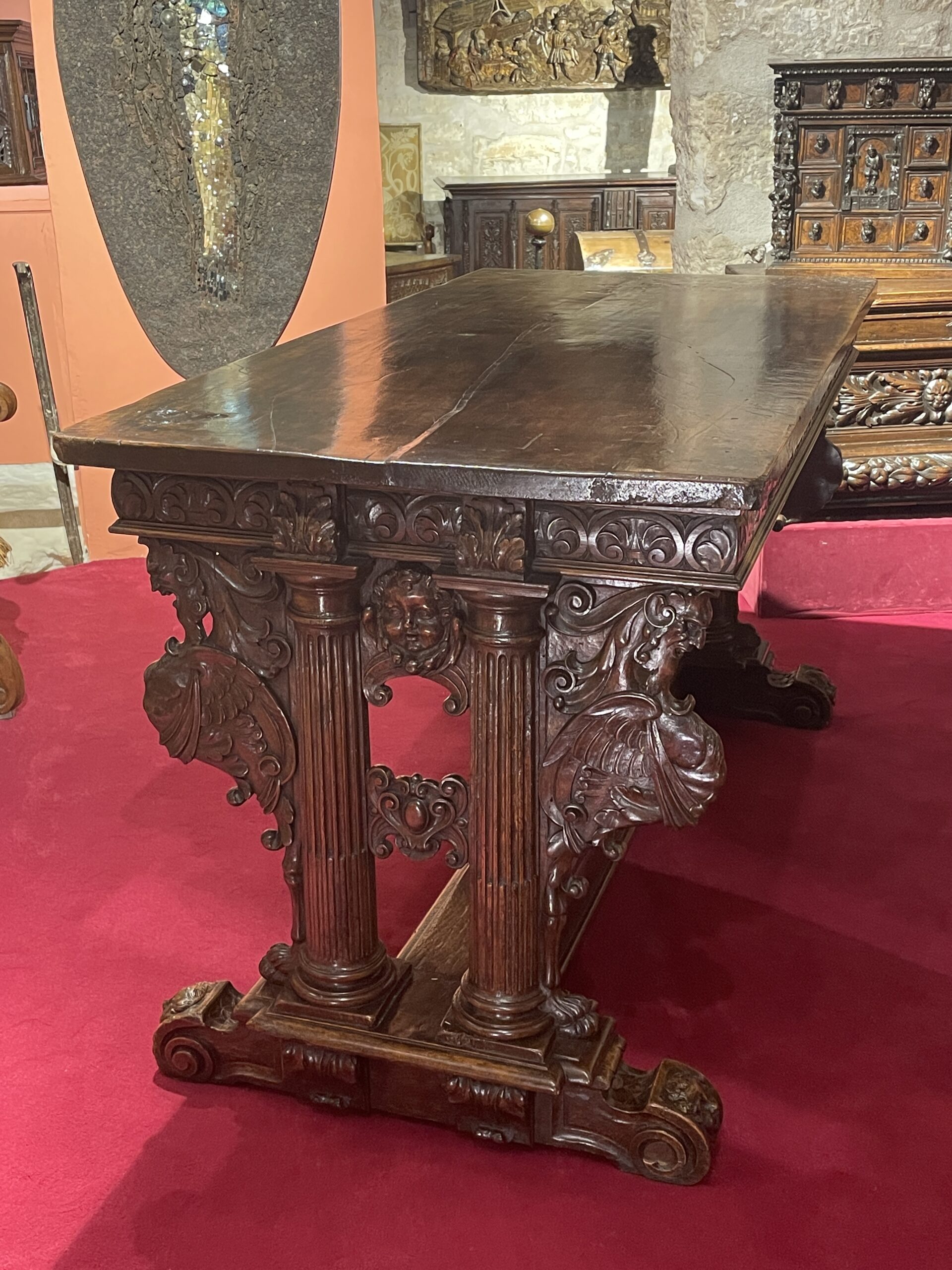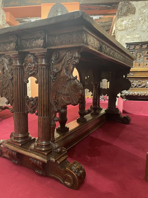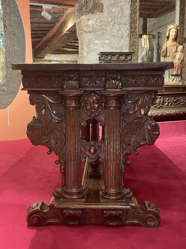 This very beautiful table of “classical” composition and structure belongs to the stylistic trend that was born in Ile-de-France and Val-de-Loire in reaction to the ultramontane style that was then predominant in other regions. It is enriched with a profuse decoration spread over all the surfaces