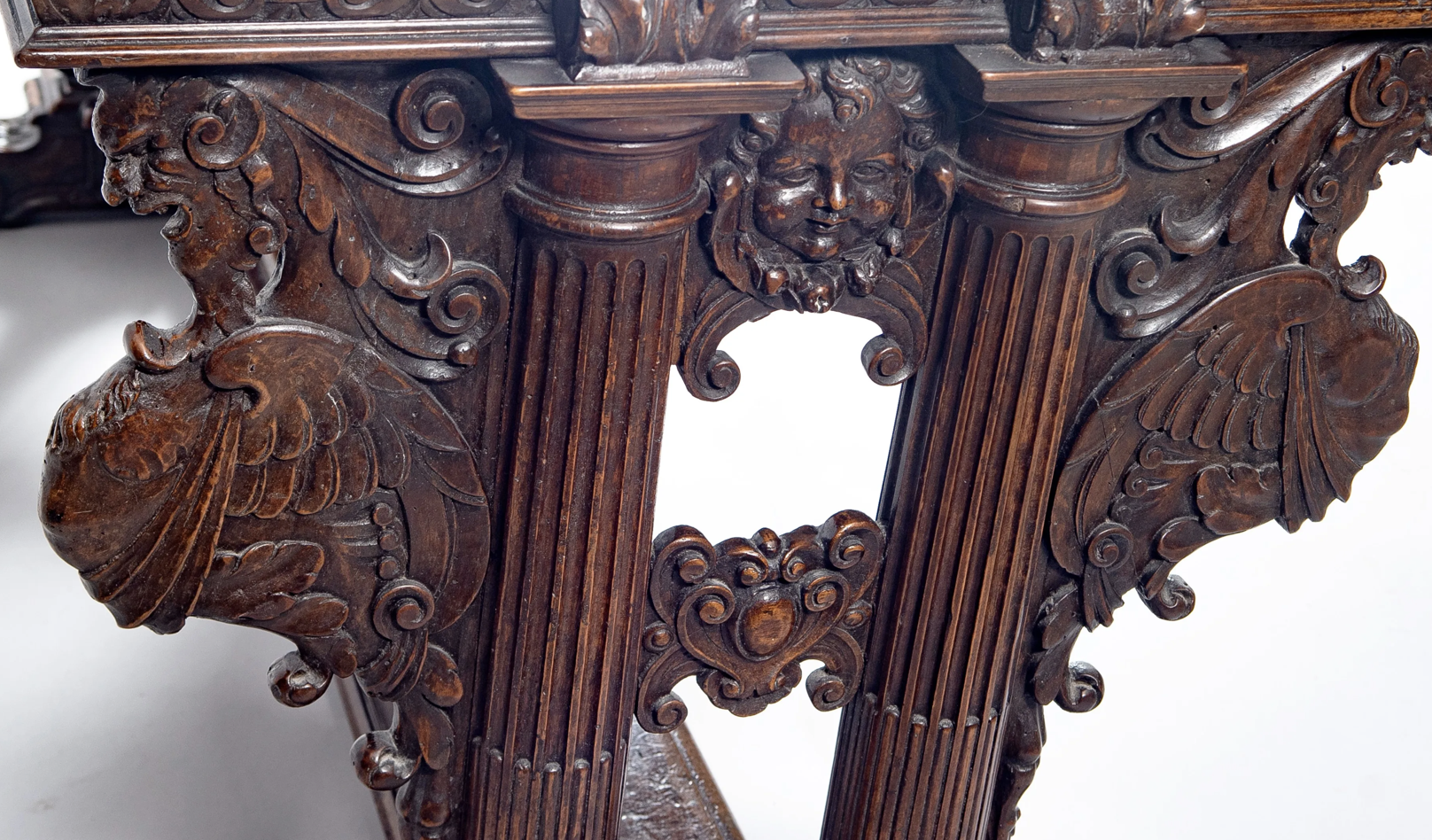 The first tables made up of two legs connected by a crosspiece and covered with sculptures first appeared in Italy, where they were inspired by the ancient cartibulum. In France, artists and cabinetmakers took up this ultramontane model and reinterpreted it to and reinterpreted it to suit French taste. The fan-shaped, caryatid, columned or balustered supports were adorned with sculptures, making them particularly decorative. They then became real luxury objects and aroused great interest.