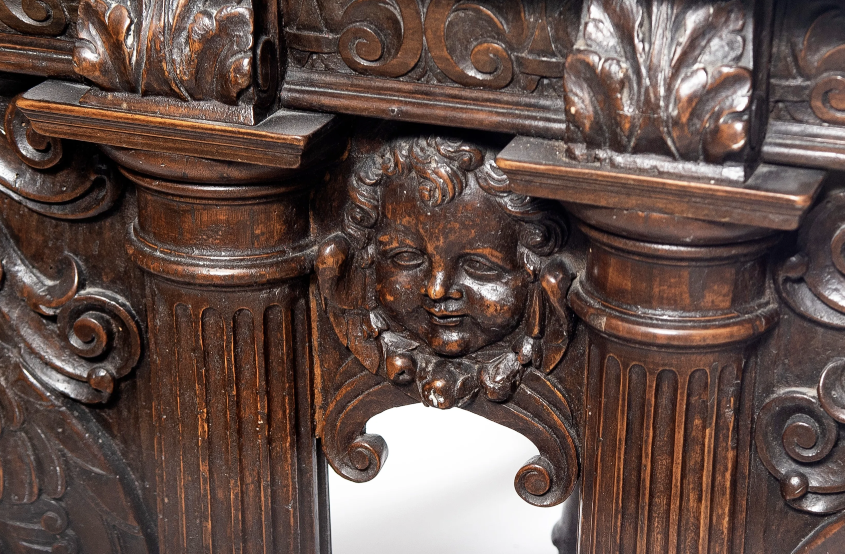 Two fluted columns rise from two thick skids, decorated with scrolls and cherubs’ heads, and joined by a wide crosspiece. The latter are flanked by two winged chimeras whose faces, with hooked noses and open mouths, are extremely expressive. Between the columns is a finely executed winged cherub head.