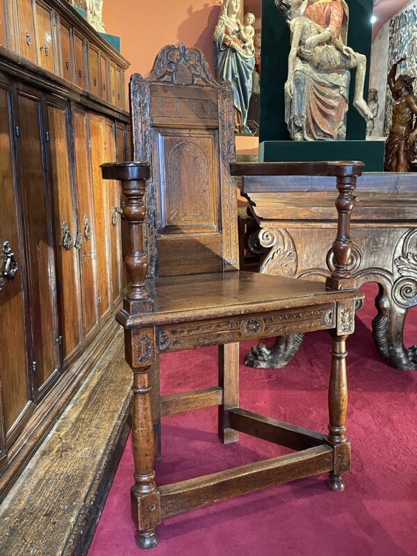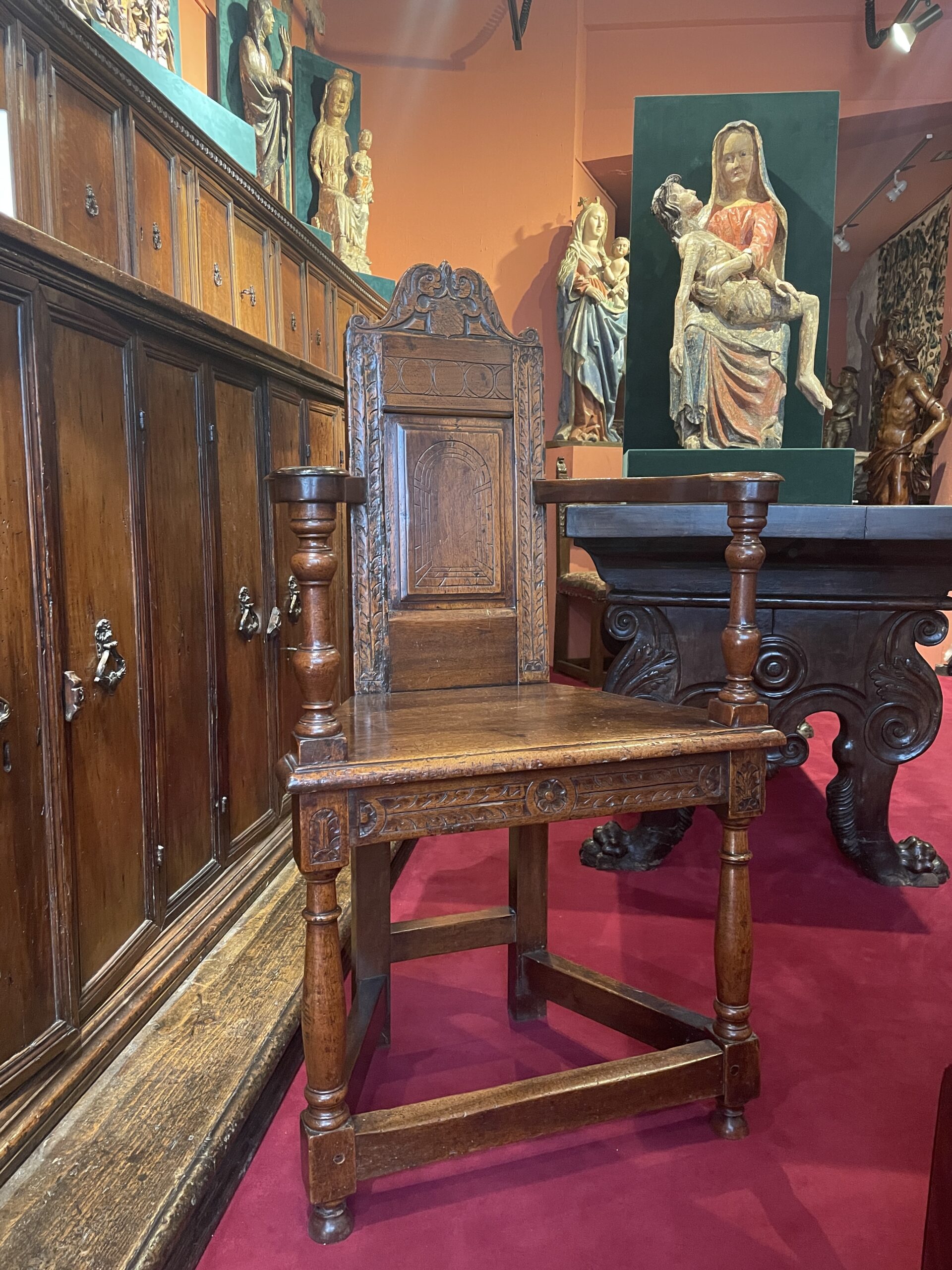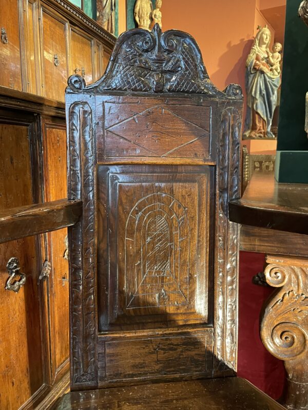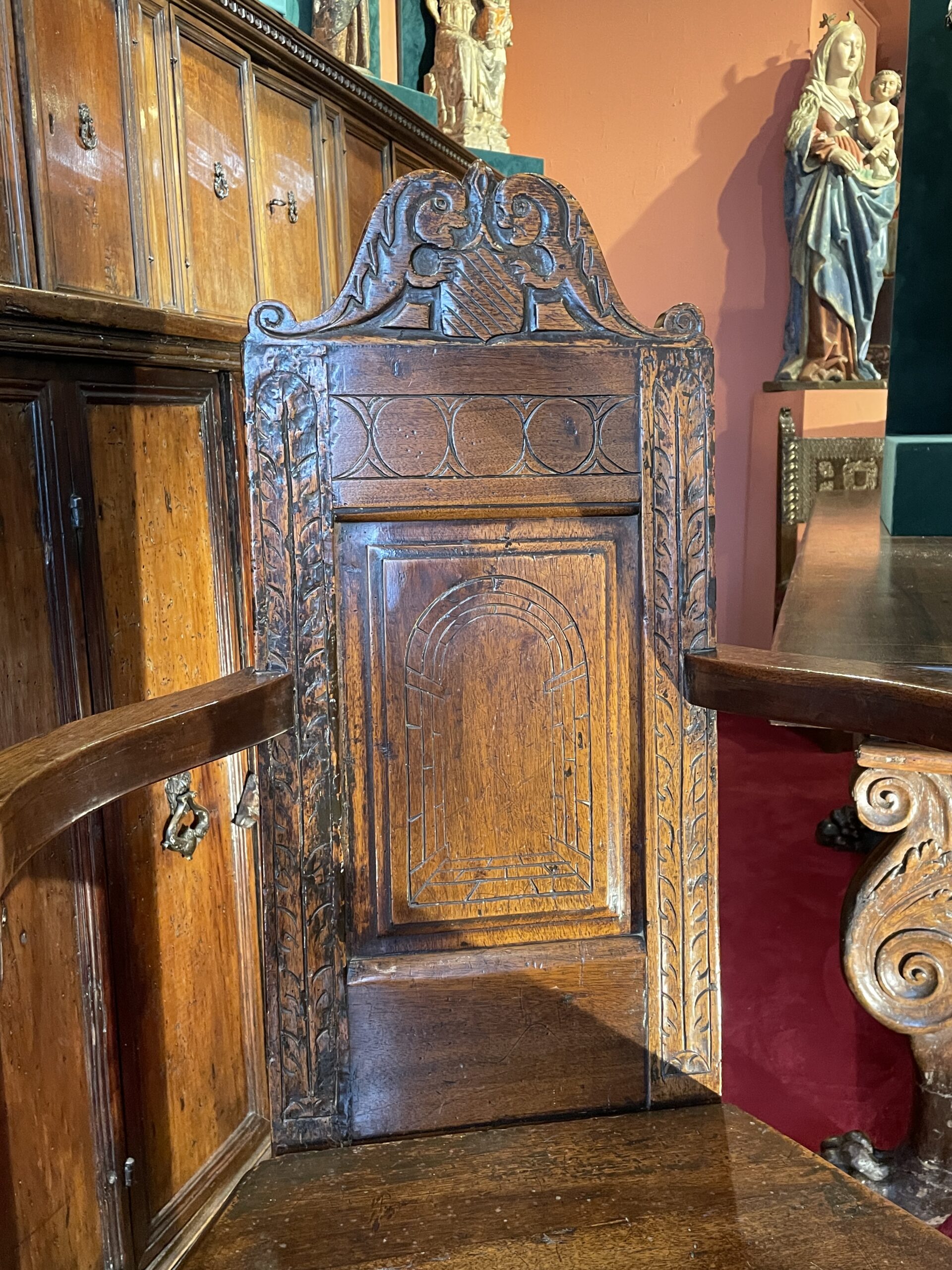 The curved armrests rest on four turned baluster supports. The belt is decorated with two bird’s feathers on either side of a flower. The high, rectangular and narrow backrest consists of a frame surrounding a panel decorated with a feigned perspective. A second panel is cut into lozenges and triangles and surmounted by a pediment decorated with volutes of foliage facing each other. The presence of this perspective shows the enthusiasm of the commissioners for the paintings of the First Italian Renaissance, with its rediscovery of mathematical principles and the architecture of Antiquity.