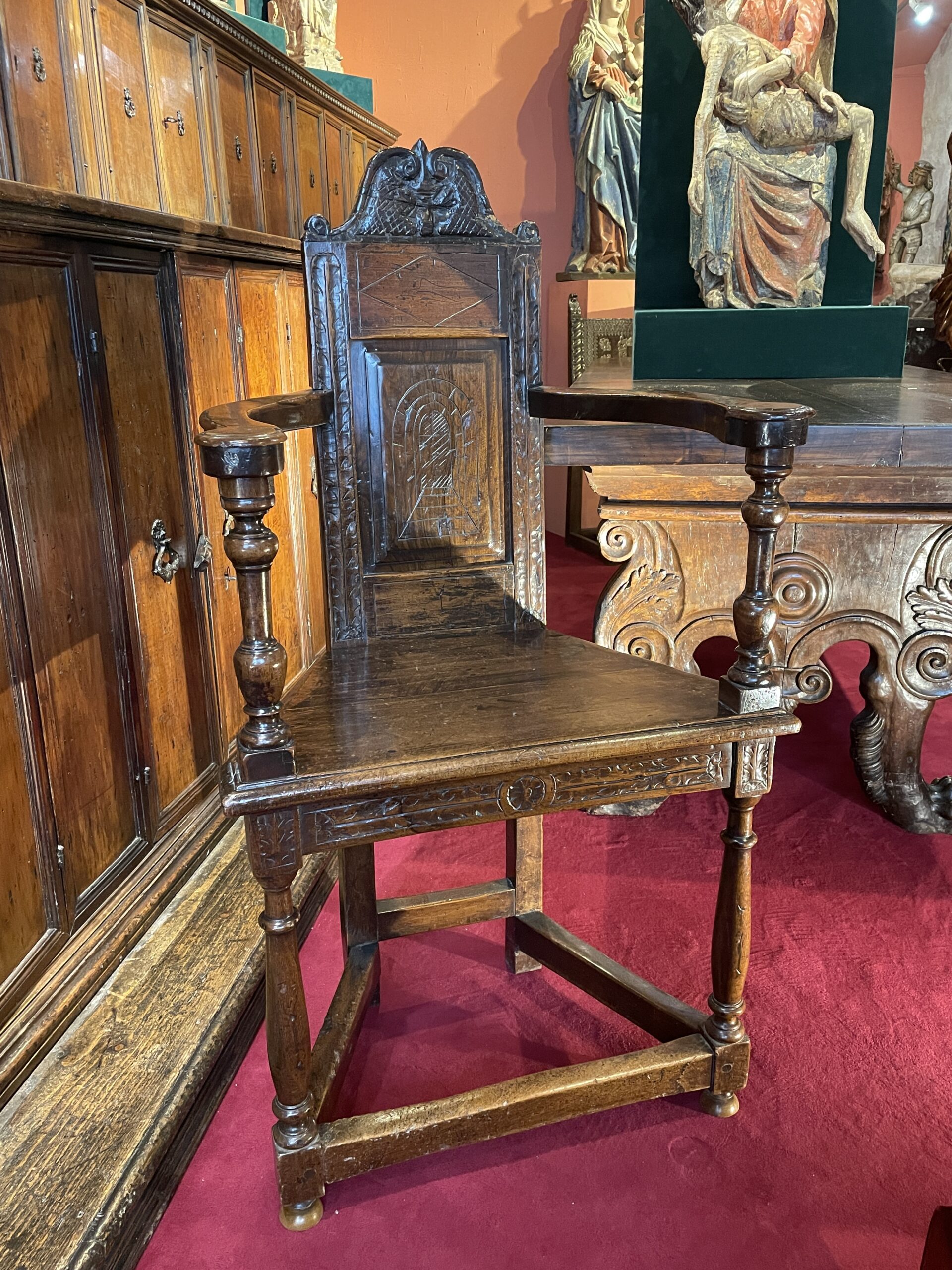 The trapezoidal armchair is a typically French creation from the second half of the sixteenth century. Although the nineteenth century gave it the name of “caquetoire”, it was described in the inventories of the sixteenth century as chairs with arms in the shape of a talmouse (evoking its trapezoidal shape) to designate this seat.