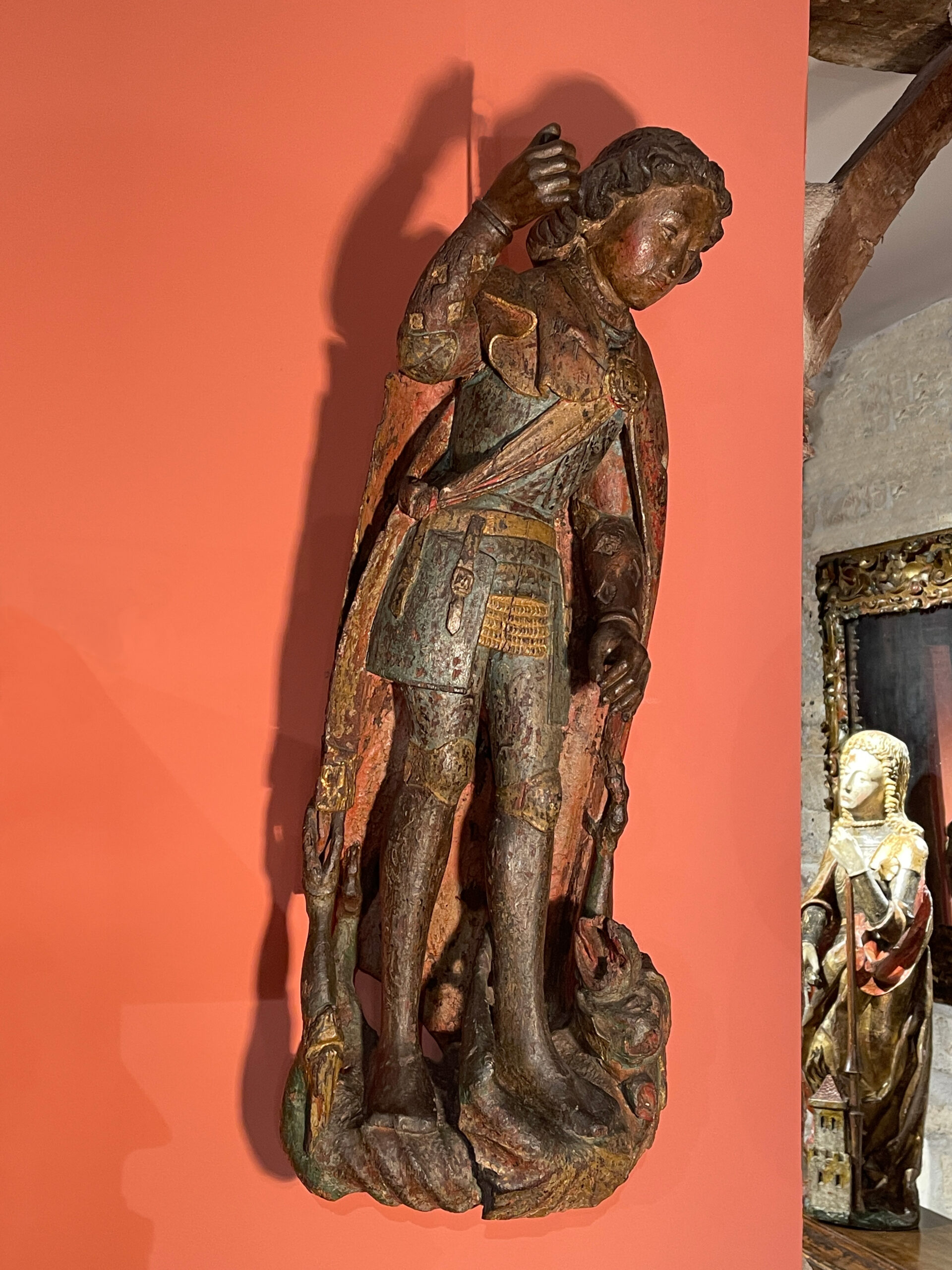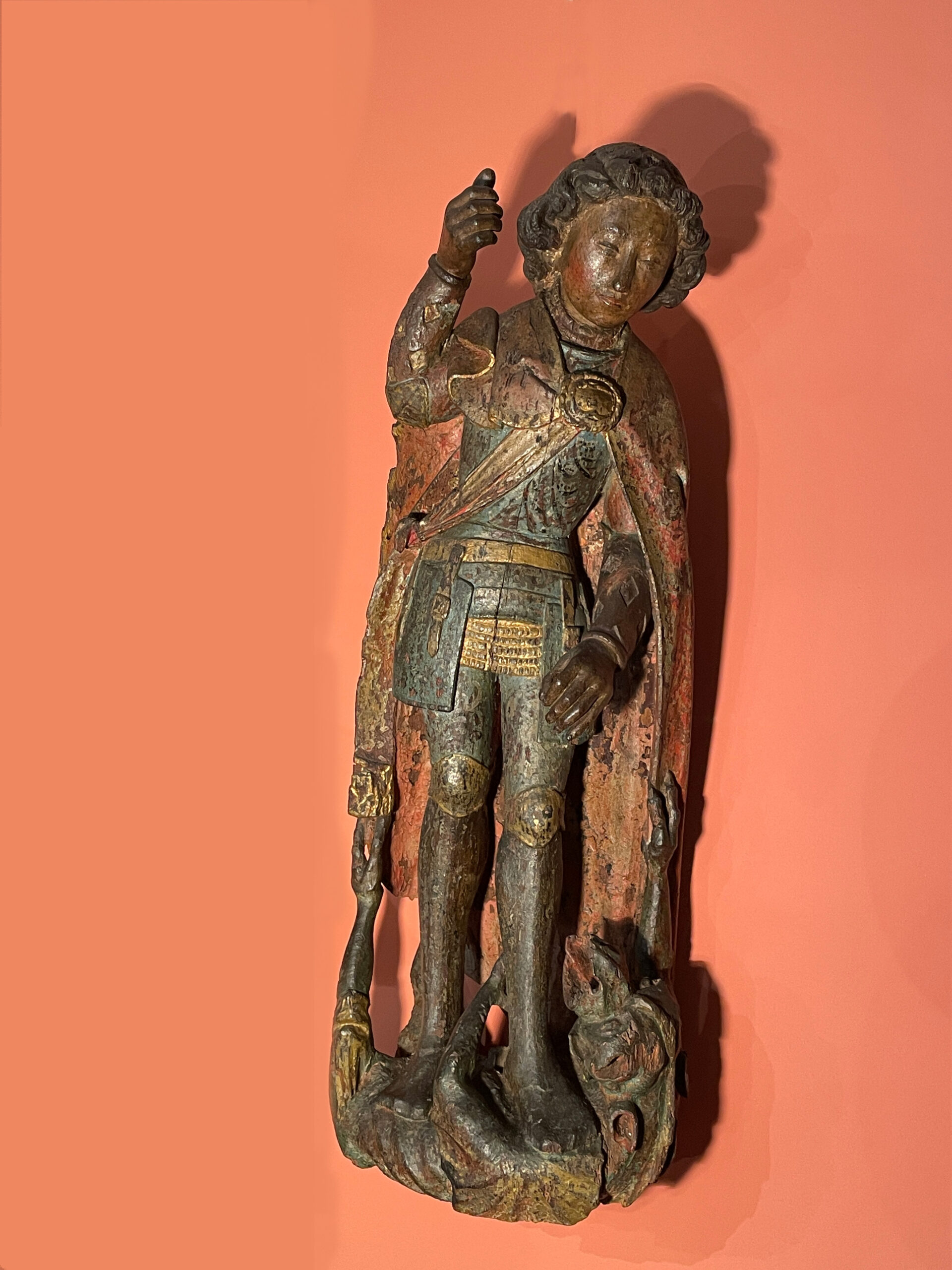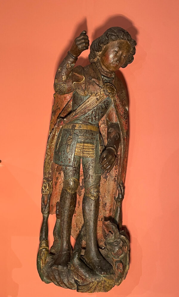 The delicate features of his face harmonize with his tall, slender figure. With elegance, he pierces the gaping mouth of the dragon he tramples underfoot. In a calm yet victorious stance, he triumphantly treads upon the defeated devil. The position of his right arm, which once held a lance, aligns naturally with his left arm, poised to subdue Satan, the fallen angel.
