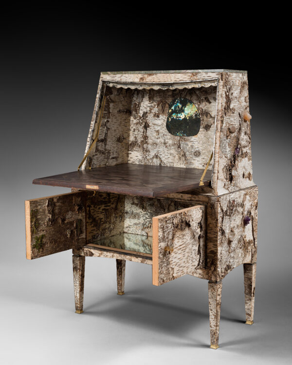 Each piece is unique and its making can take up to three months. Gallardo and Cassan operate on fine furniture (from 17th century to 1970s) playing with bark imperfections, reliefs of the material to create graphic shapes and motifs. Mineral inlays (labradorite, rock crystal, amethyst) punctuate the surfaces as gems turning these pieces of furnitures into cabinets of curiosity.