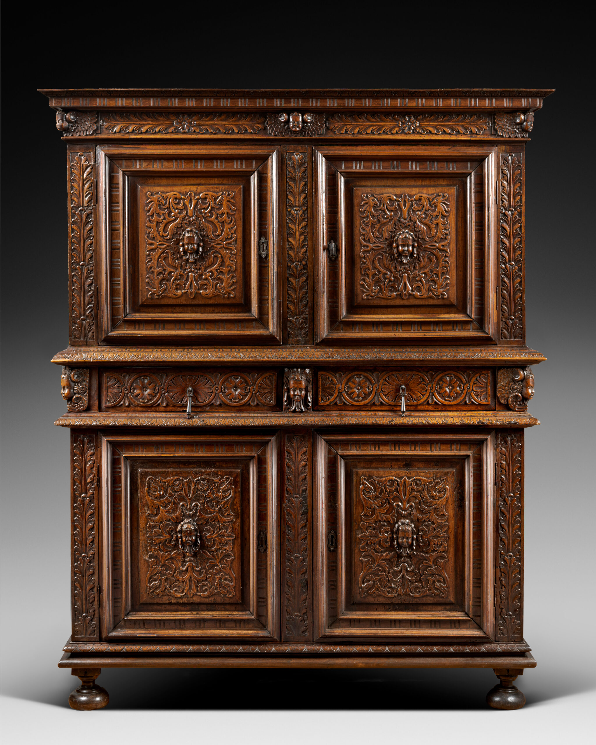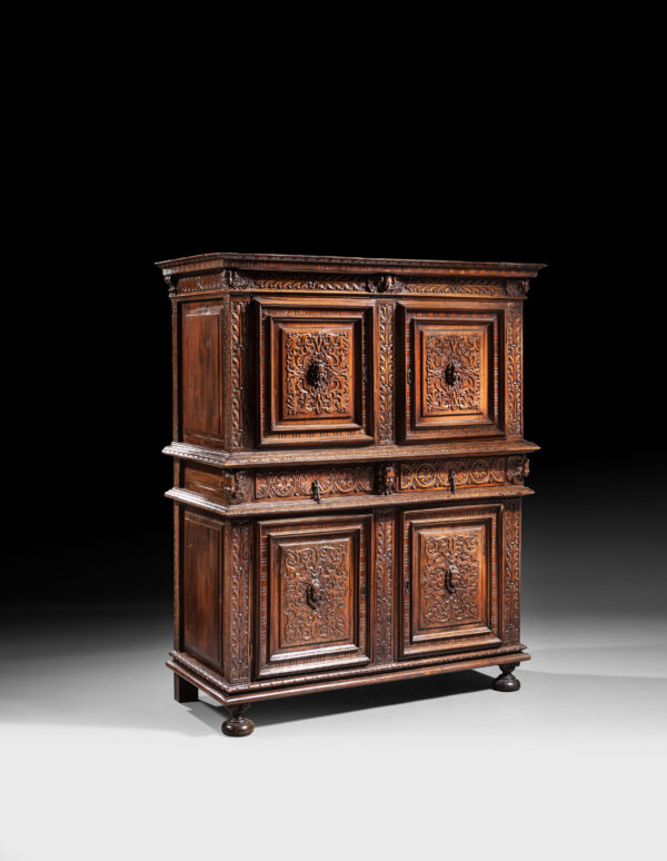 A protruding belt comprising two drawers divides the two bodies. The jambs and frames are ornate with foliage and grant the cabinet a ternary rhythm. Because of this, the composition appears as much horizontal as vertical.