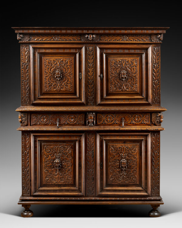 This rare walnut cabinet with a beautiful patina is a fine example of Lyon productions during the second half of the 16th century, allying proportion harmony with beautiful low-relief carvings covering almost the entirety of the panels’ surface. Incredible testimony of its place and time of creation this cabinet presents a unique character. The desire for rigour was undoubtedly the cabinet-makers keyword during the making of this astonishing piece.