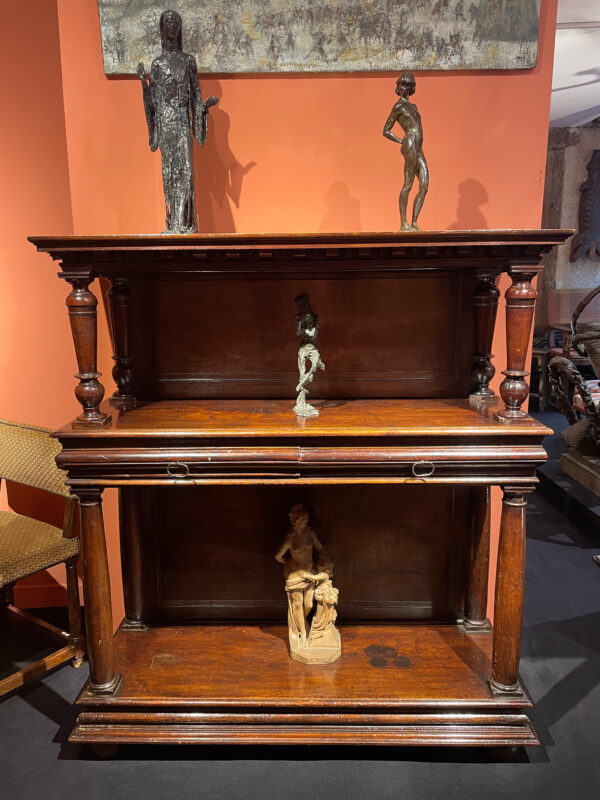 The upper level has an almost identical layout to the lower one, but the smooth-shafted columns have been replaced by two columns and two half-columns turned into balusters. They carry an entablature alternating modillions and rosettes.This ceremonial dresser was intended for the display of precious crockery, gold and silverware and sometimes even for the presentation of food.