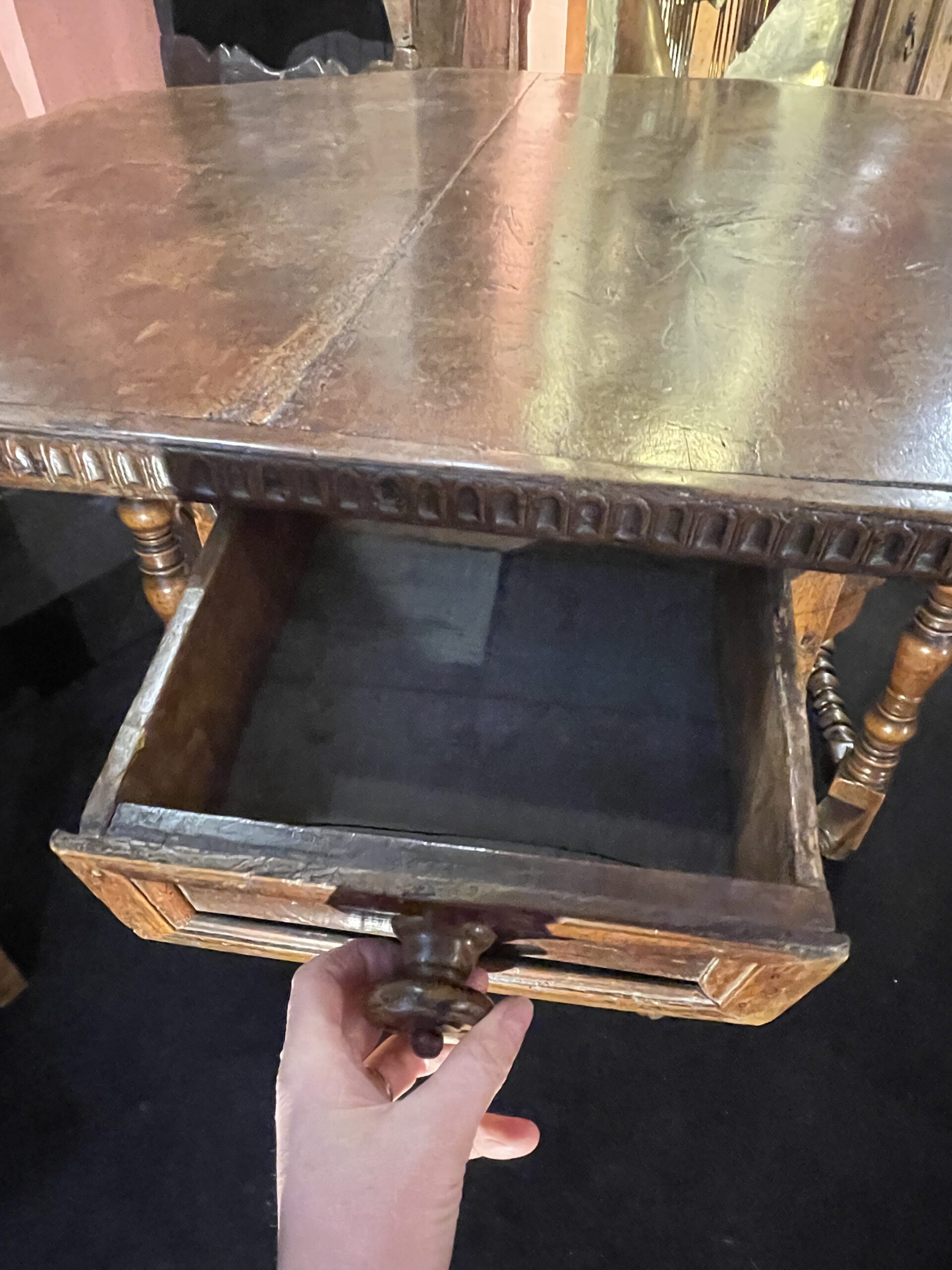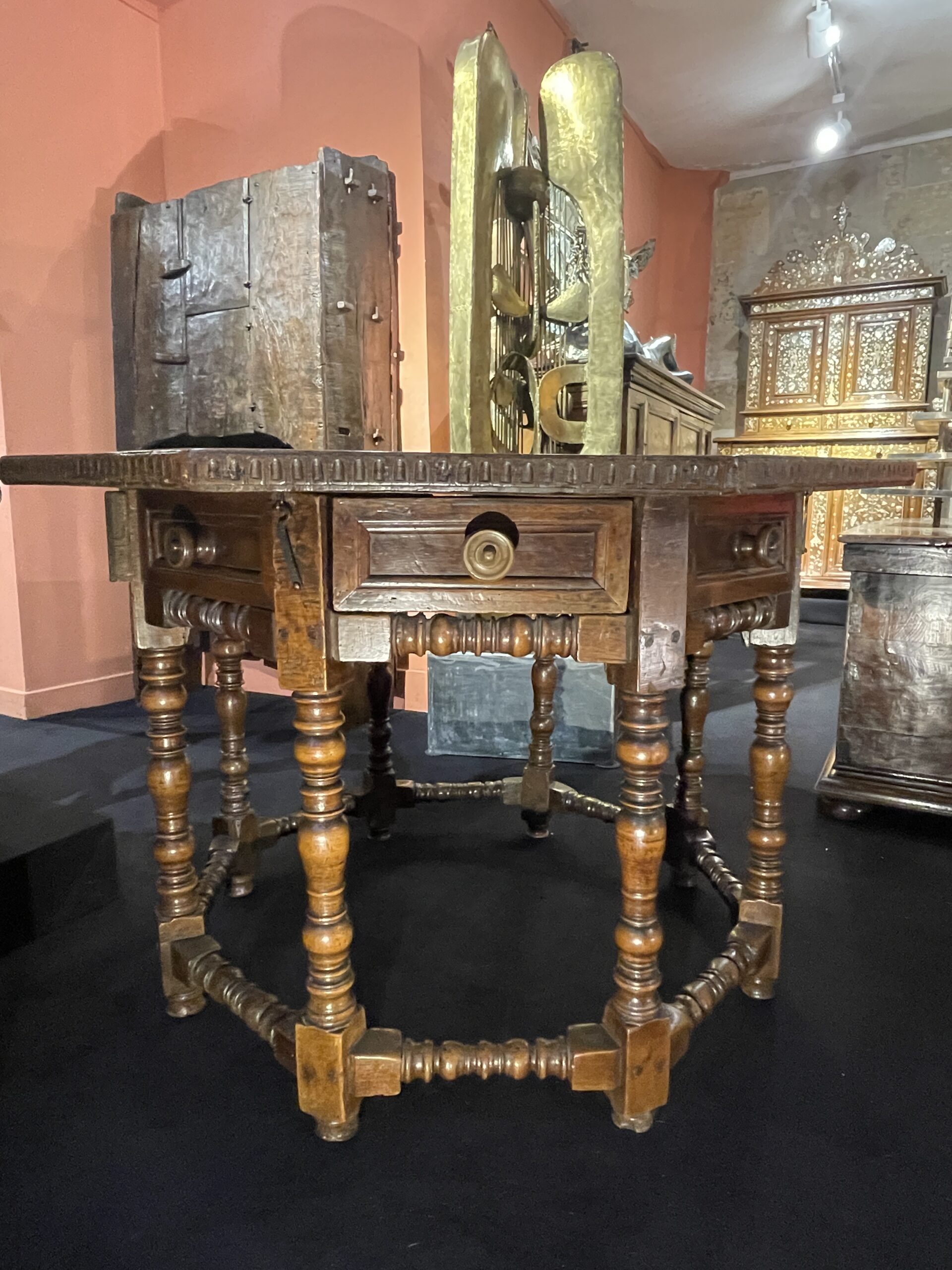 The belt accommodates four real drawers and four others in trompe l’oeil, with their turned wooden knobs. The table top is decorated on its round with a frieze of barley grains cut into the mass. A turned wooden spacer under each drawer recalls the legs of the table, bringing balance to the whole.