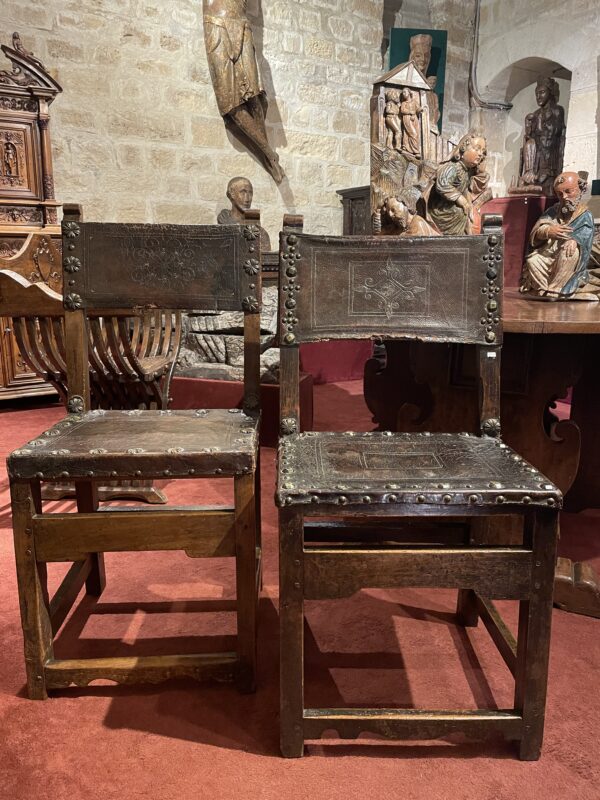 On one of the chairs, a floral motif inserted into two concentric rectangles is sewn onto the leather. These same rectangles are found on the seat.
