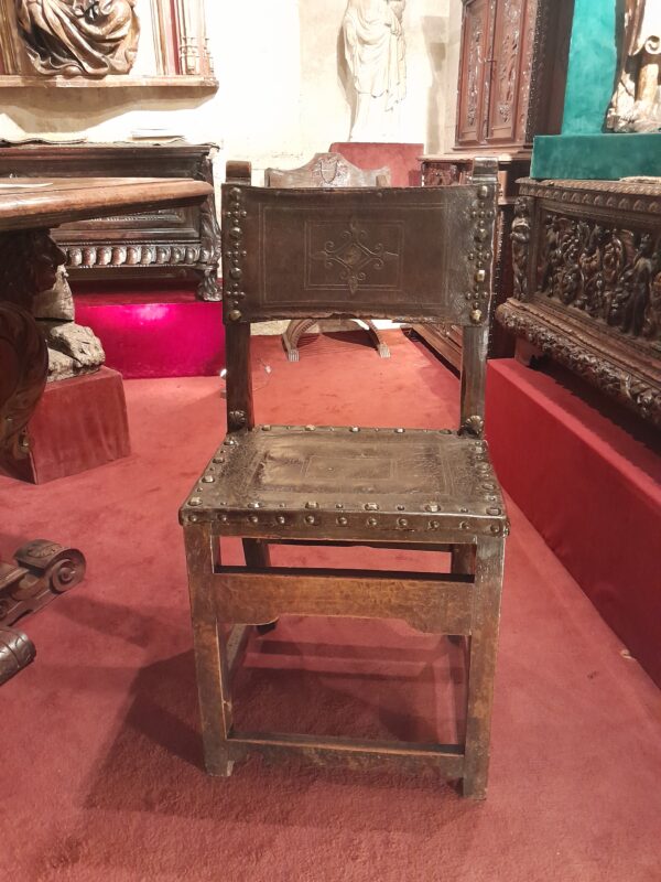 Back and seat are covered with leather sheets, original, fixed by brass nails whose arrangements and sizes contribute to the decor.