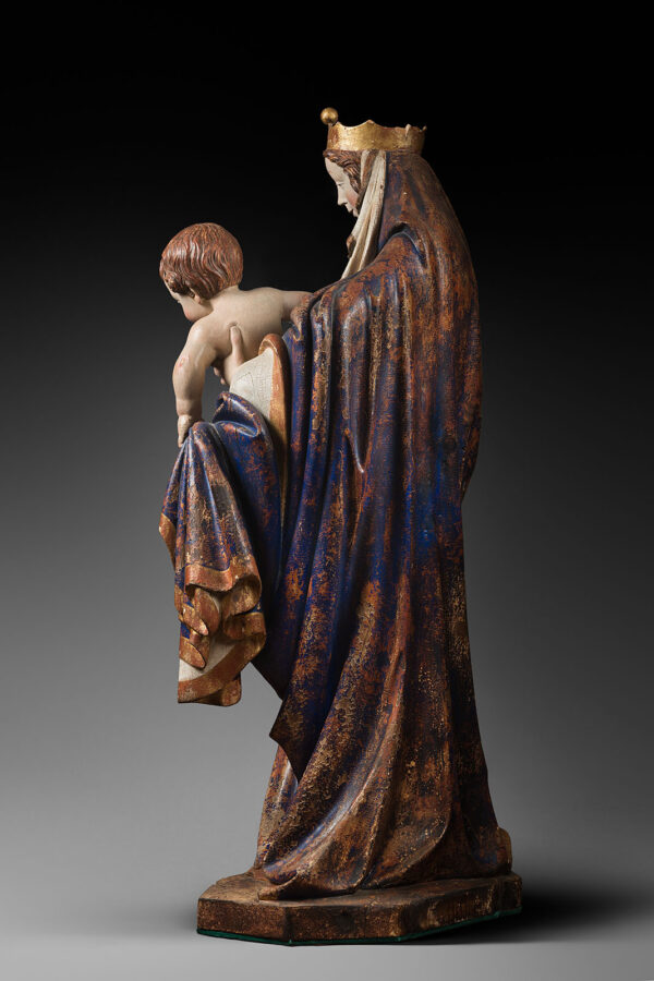 This Virgin and Child evokes an ensemble of Virgins statues from Bohemia of which the most famous is the Krumlov Madonna (Kunsthistorisches Museum, Vienna), from an anonymous sculptor. Those madonnas characteristically combines realism and tenderness. Appearing in the late 14th century in Prague and Salzburg the style spreads to the whole central Europe. With a strong lyrism the Virgin always carries the naked or semi naked Infant Jesus on her left leg emerging in swirl of folds and pleats. In each of those Salzburg’s Madonnas the sculptor took a great care to the interaction between the Virgin and her son.