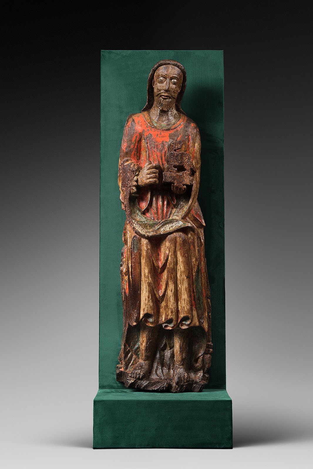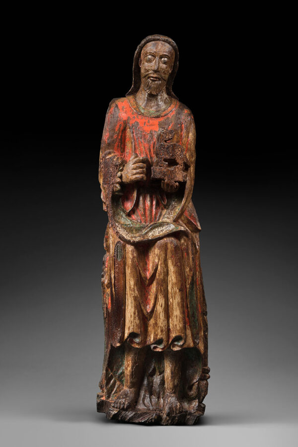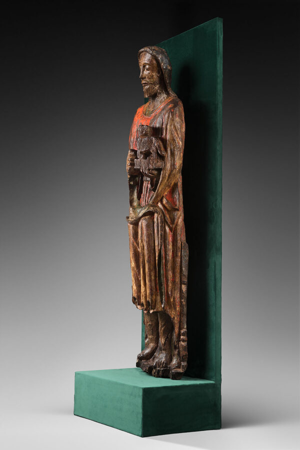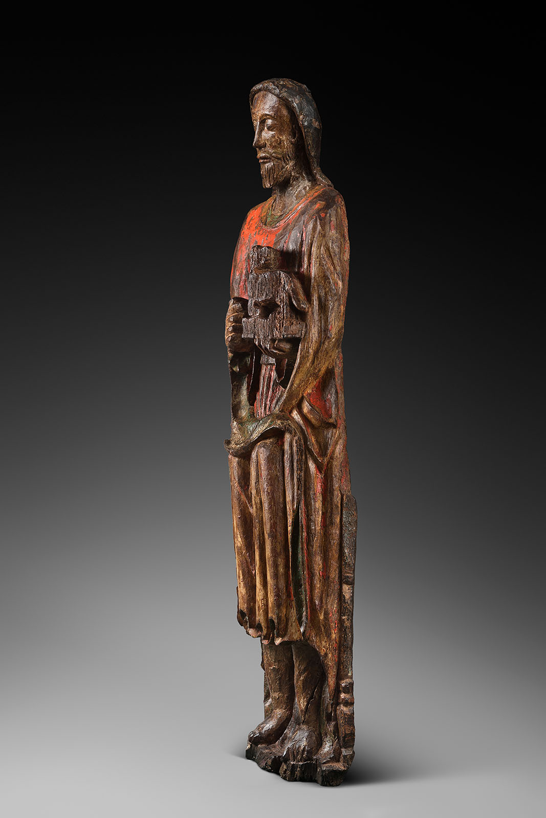The hieratic posture of our Saint John the Baptist, his elongated proportions, the respect of the Eastern symbolism of the hand gesture as well as his exophthalmos and supple drapes are clearly characteristics from the 13th century.