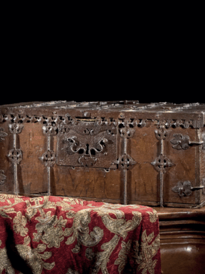 BEAU COFFRET EN CHENE BARDÉ DE FER D’ÉPOQUE GOTHIQUE