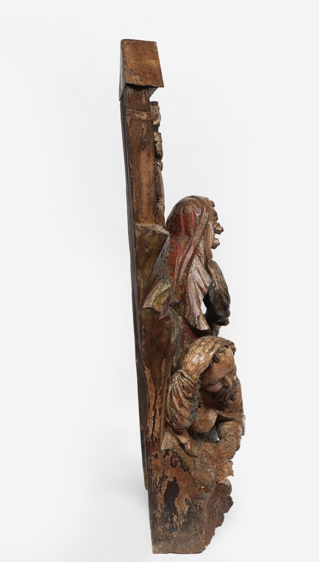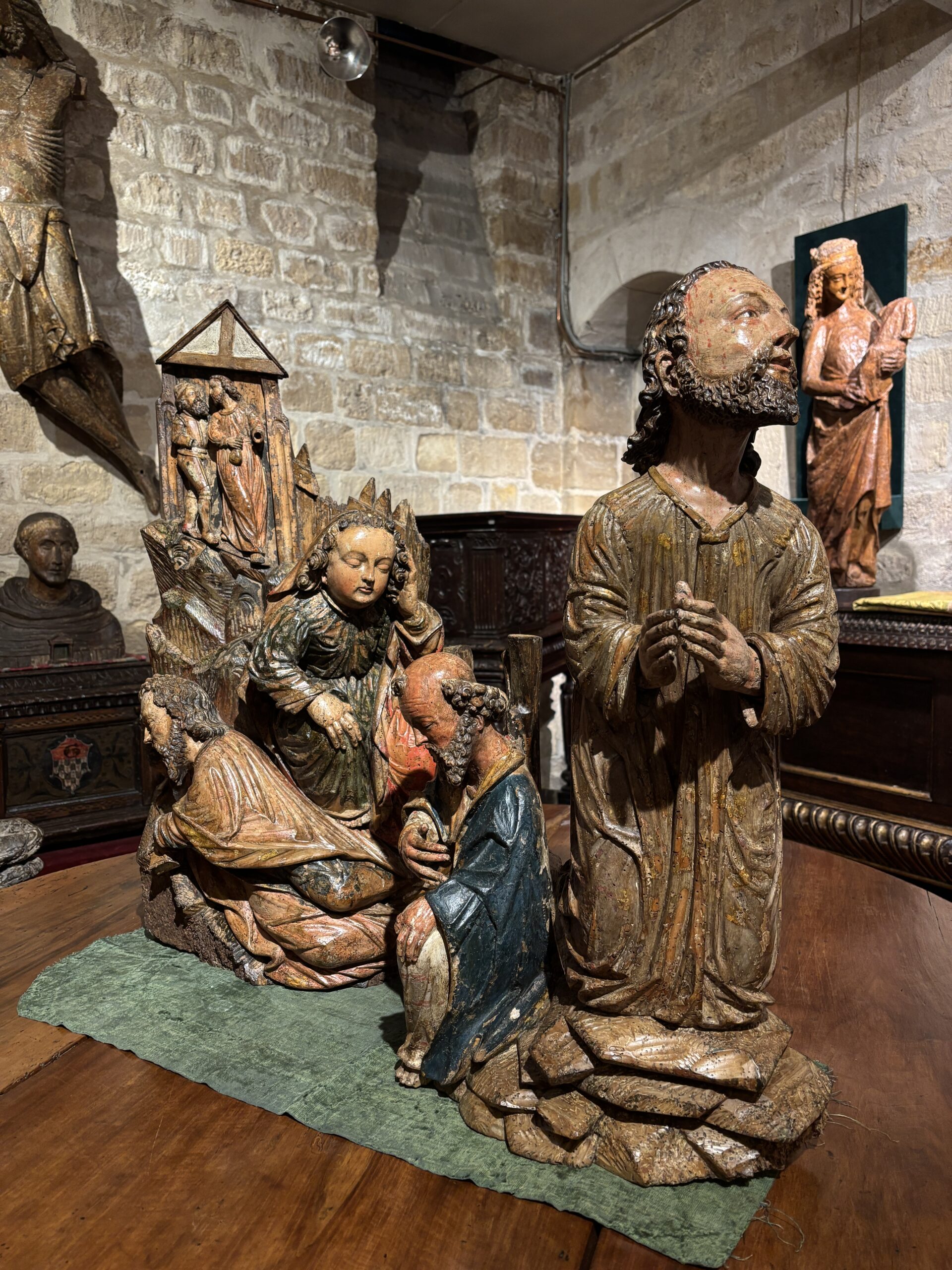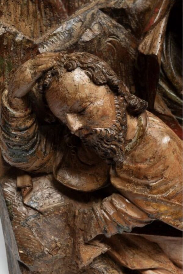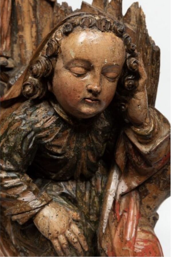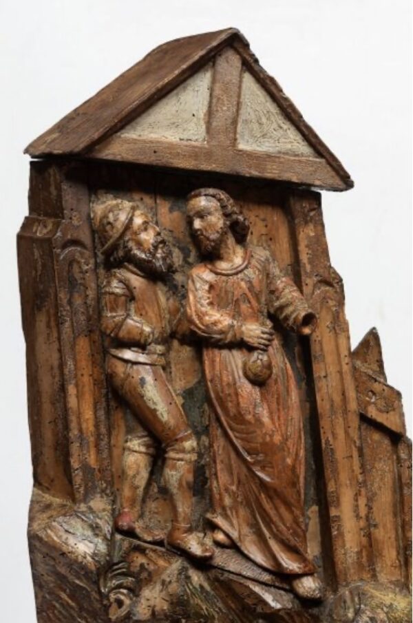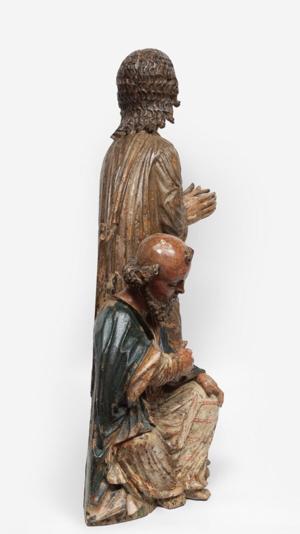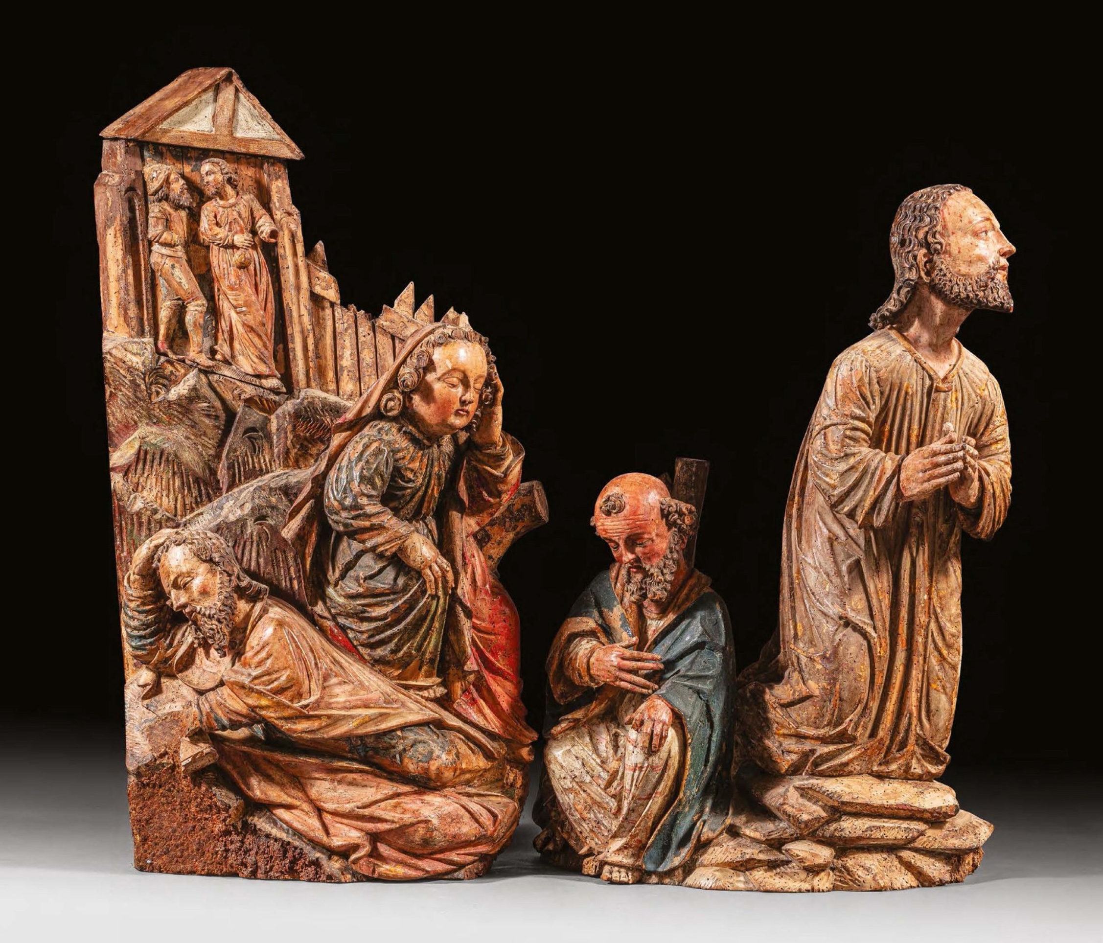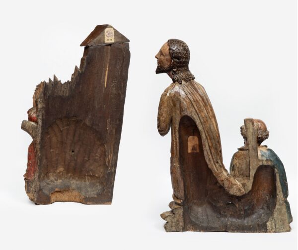 Deux importants groupes d’un même retable en tilleul polychromé, représentent le Christ au Mont des Oliviers. Le dos est évidé.