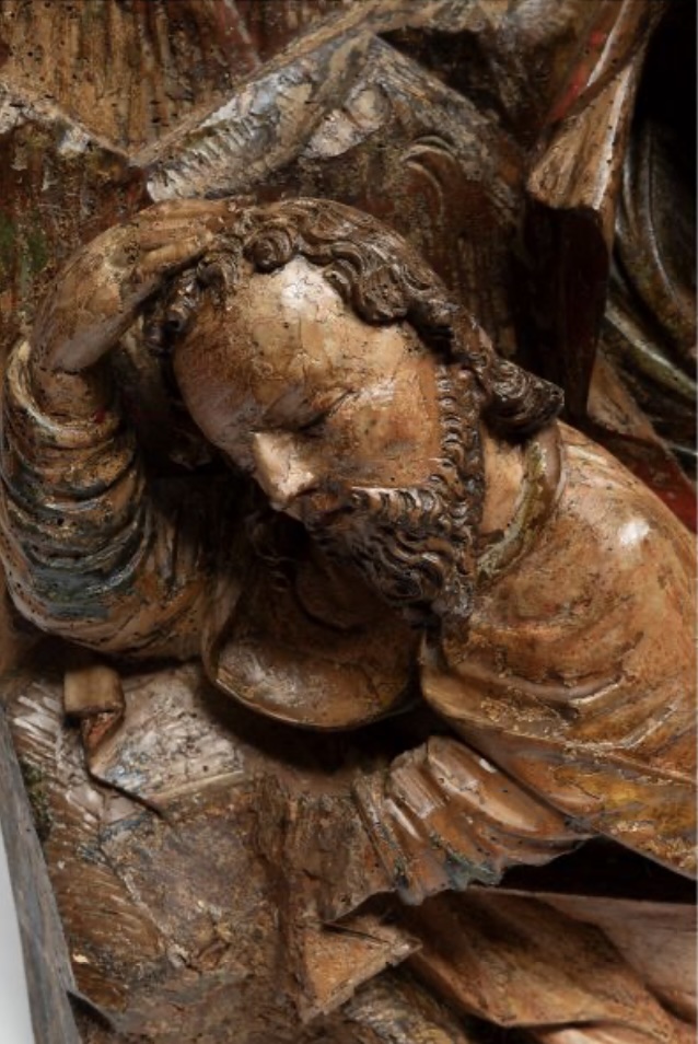 Au premier plan, Saint Pierre endormi, est aisément reconnaissable avec son crâne chauve d’où émerge seulement une touffe de cheveux sur le front et sa chevelure frisée formant une tonsure, à sa barbe courte et bouclée. Sur le groupe de gauche, se trouvent les deux fils de Zébédée endormis : Jean, jeune et imberbe, et son frère Jacques le majeur qui tient un livre à la main.