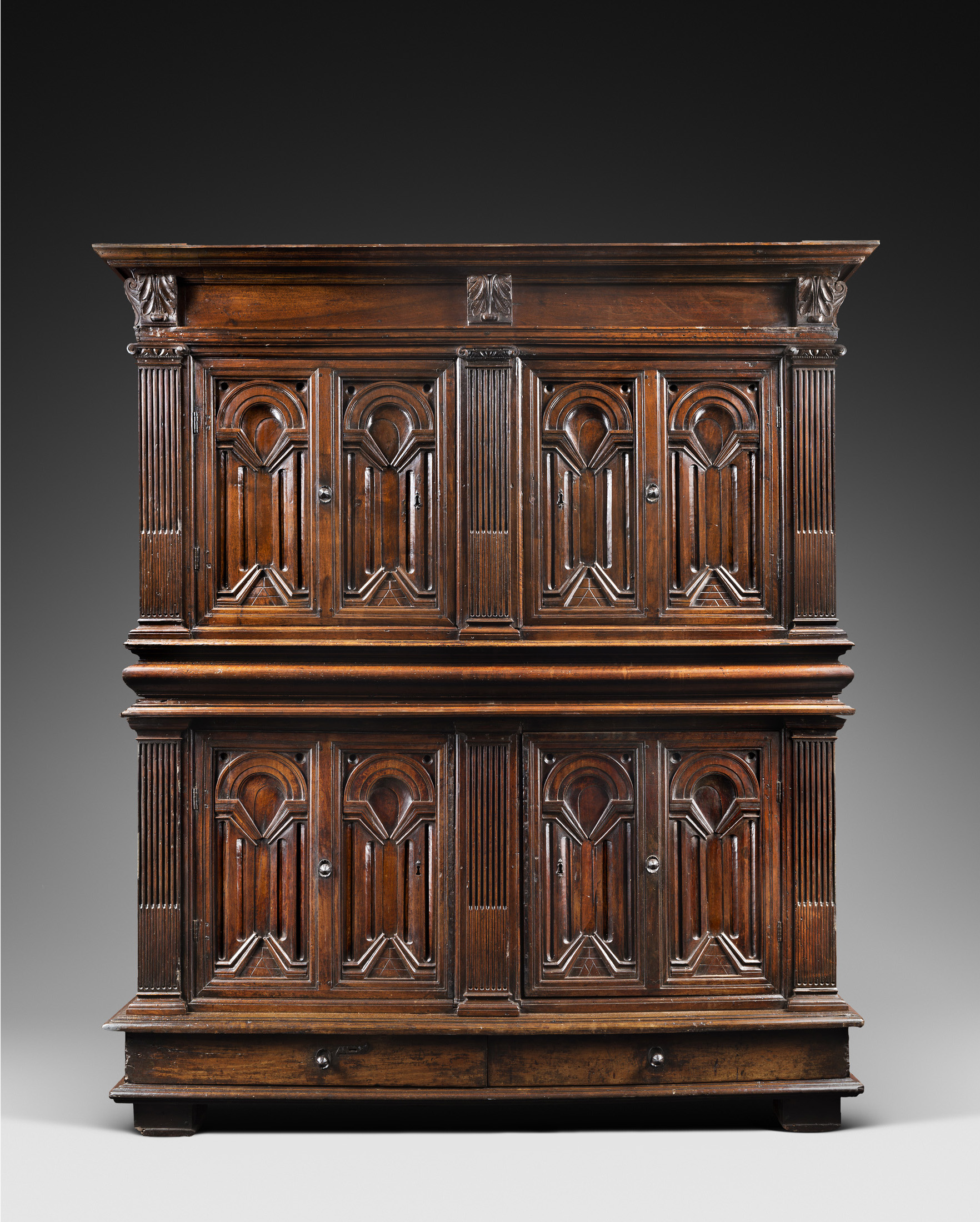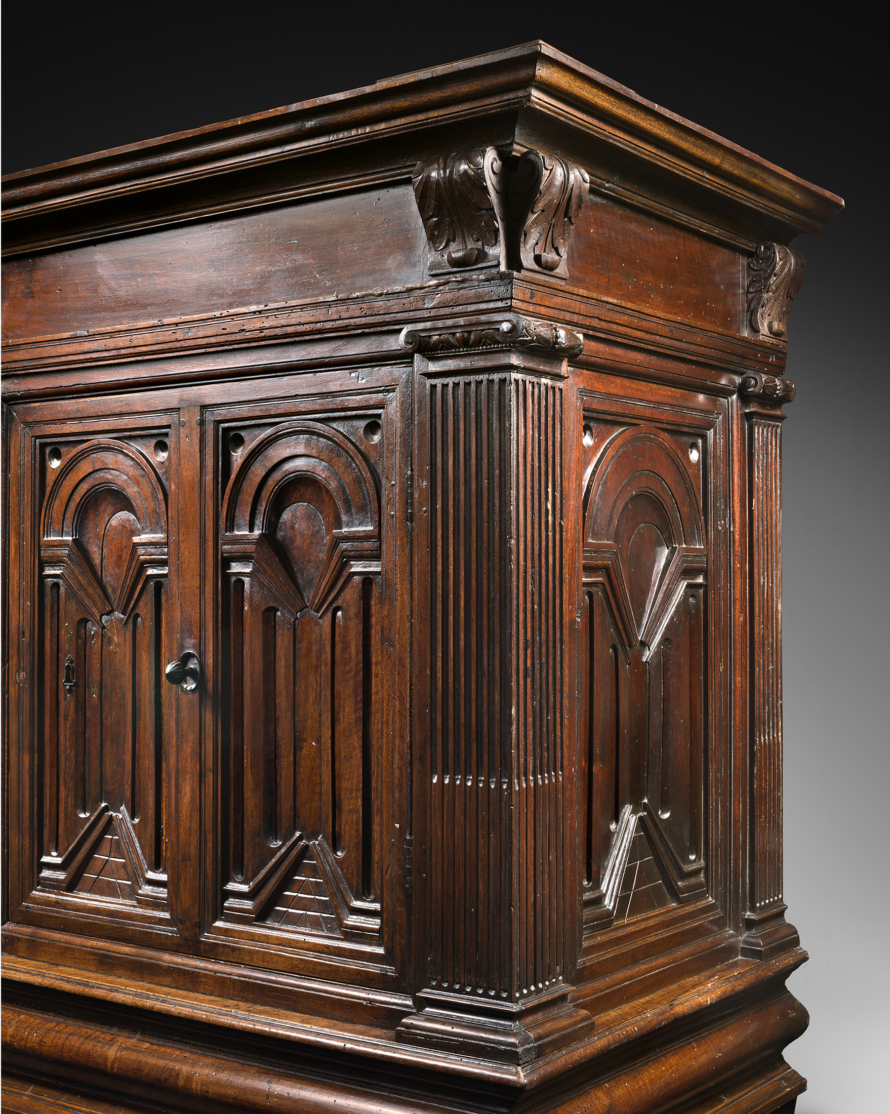 Cette puissante armoire aux panneaux à la fois sobres et sophistiqués représentant des arcades, rappelle immédiatement cette fascination propre à la Renaissance. Dans les arts décoratifs ces sujets de trompe-l’œil étaient majoritairement réalisés en marqueterie. La conception d’une vue d’architecture en perspective, sculptée dans une seule planche de bois massif, était bien plus difficile à accomplir et nécessitait une très grande maîtrise de la technique et du matériau. Ainsi notre cabinet est à la fois très inhabituel et un rare témoignage de son époque.