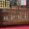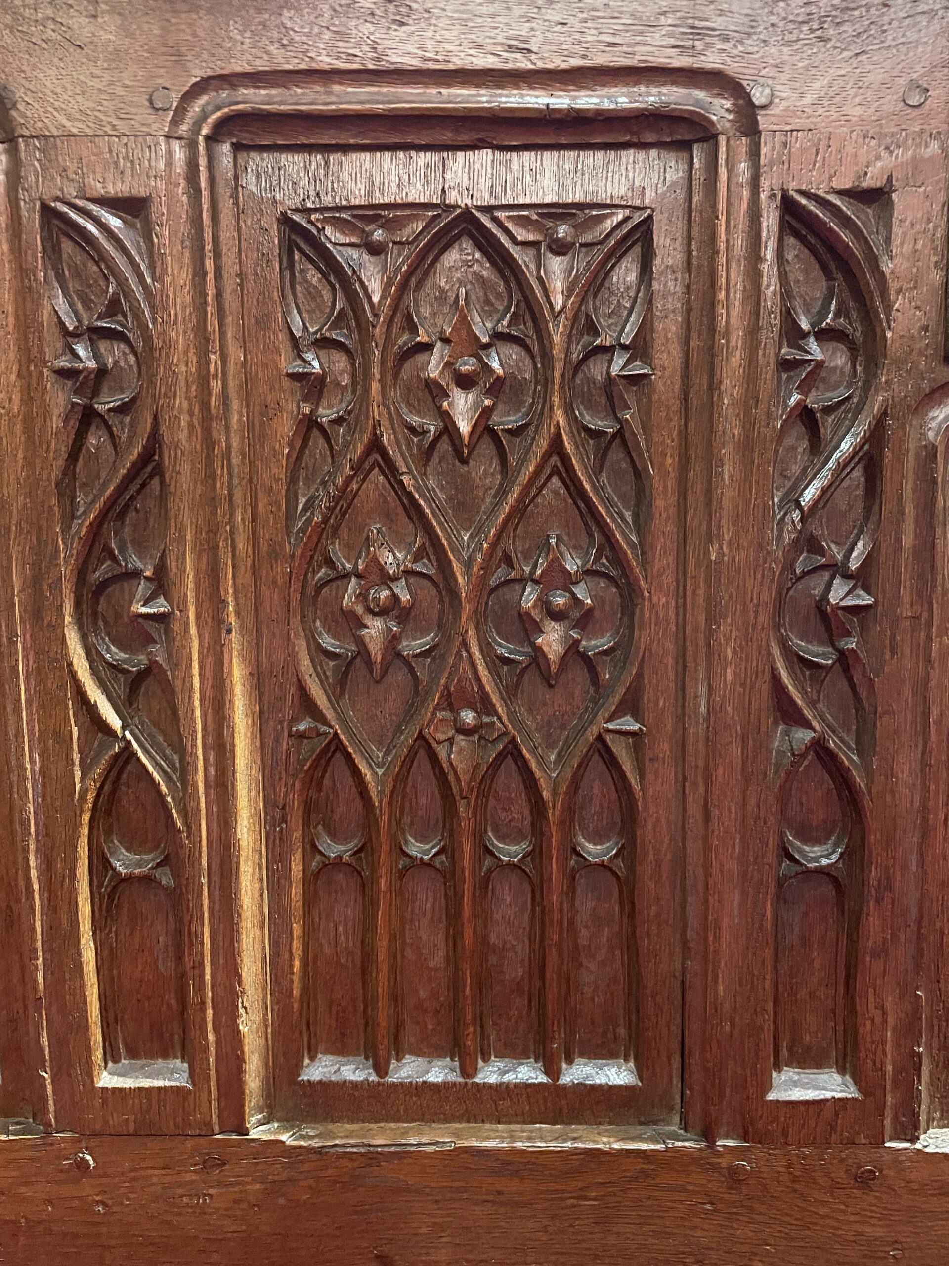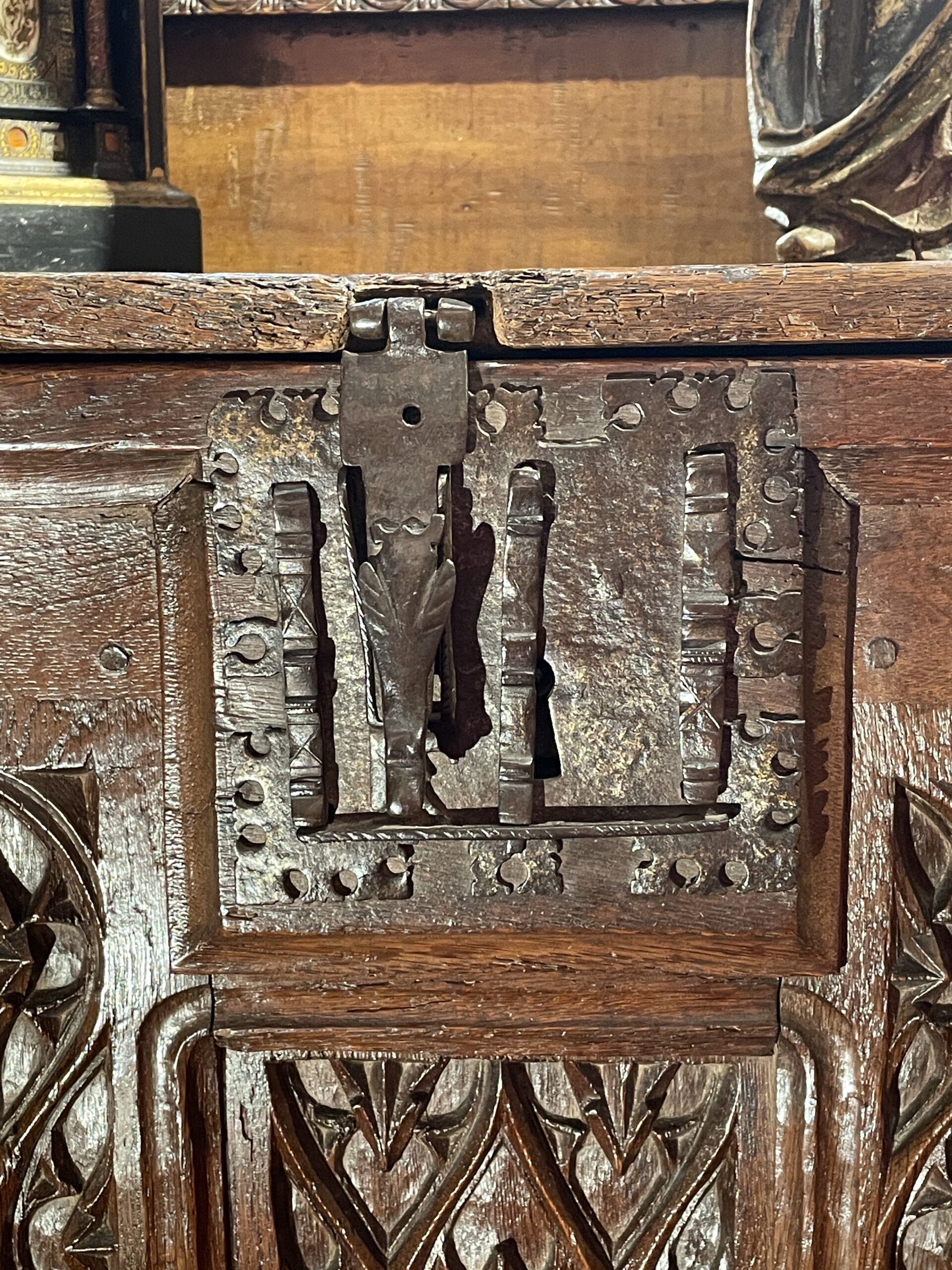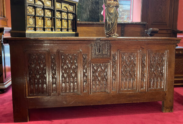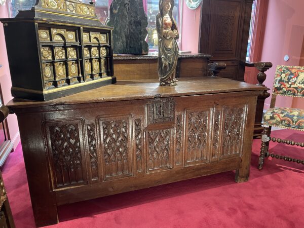 Le coffre est le meuble de rangement le plus ancien. Celui-ci, réalisé dans un beau chêne, présente une façade ornée de cinq panneaux rodés de moulures à chanfreins, embrevés dans le bâti, et accostés de quatre traverses qui les séparent. Chaque élément présente un motif de fenestrage à orbevoie, en fort relief, avec un remplage à mouchettes garnies de fleurons.
