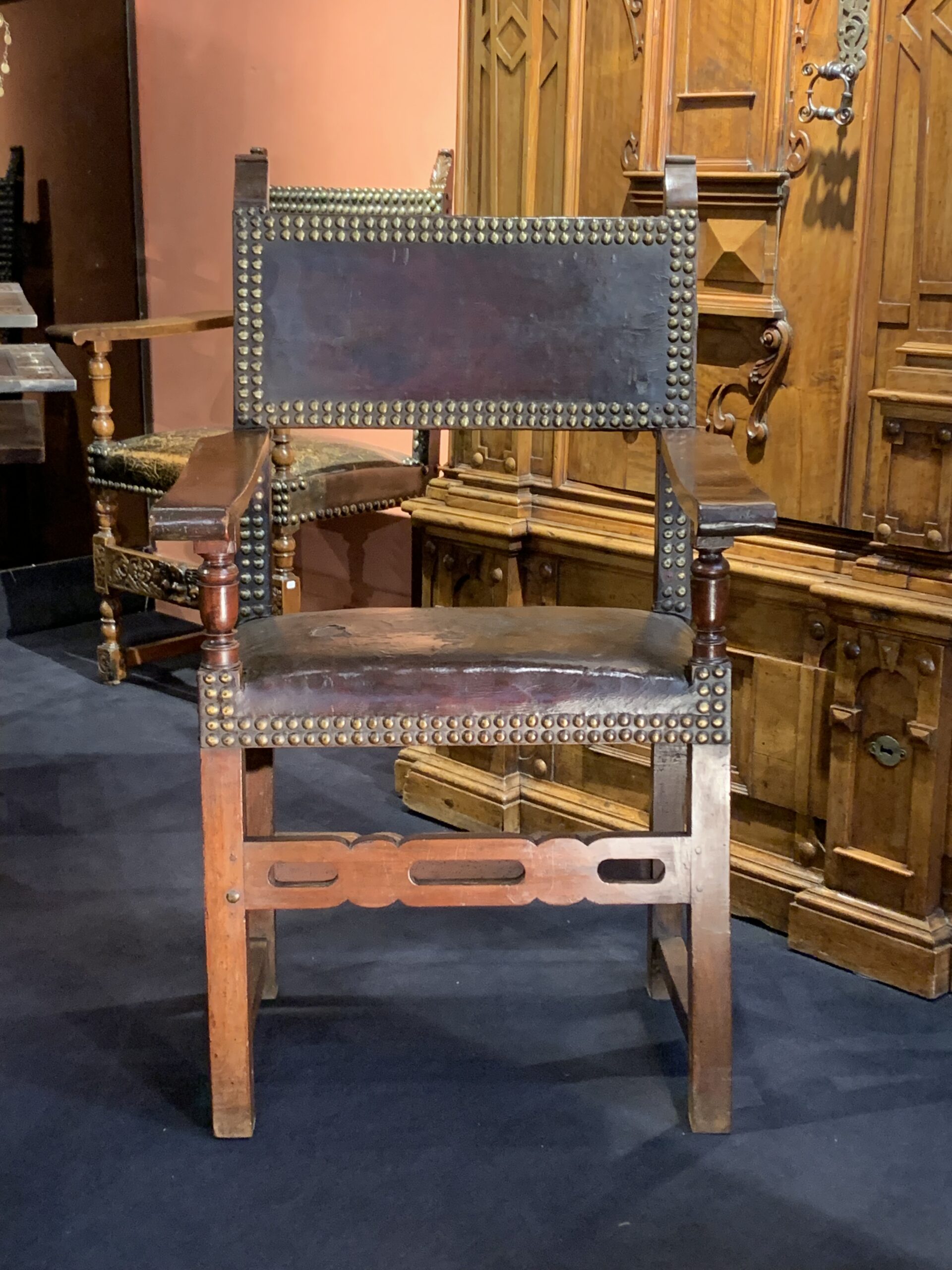 Le dossier et l’assise ont conservés leur garniture en cuirs d’origine, fixée par plusieurs rangées de clous en laiton.