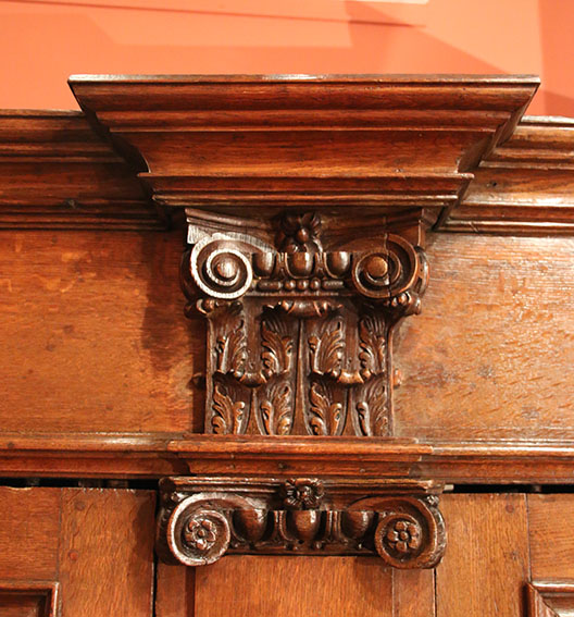 L’armoire, qui repose sur une base moulurée excavée, ouvre à deux étroits vantaux situés de part et d’autre d’un large pilastre, le dormant, surmonté d’un chapiteau ionique orné d’oves et d’une fleur dont le cœur est un visage humain ainsi que d’une fleur au centre des enroulements ioniques.
