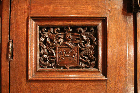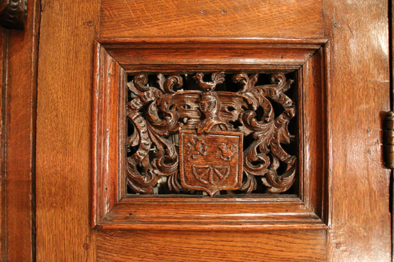 Les panneaux supérieurs sculptés à orbevoie présentent sur un lit de feuillage bordé par un ruban, deux blasons différents surmontés d’un heaume qui témoignent que ce meuble est sans aucun doute un meuble de mariage.