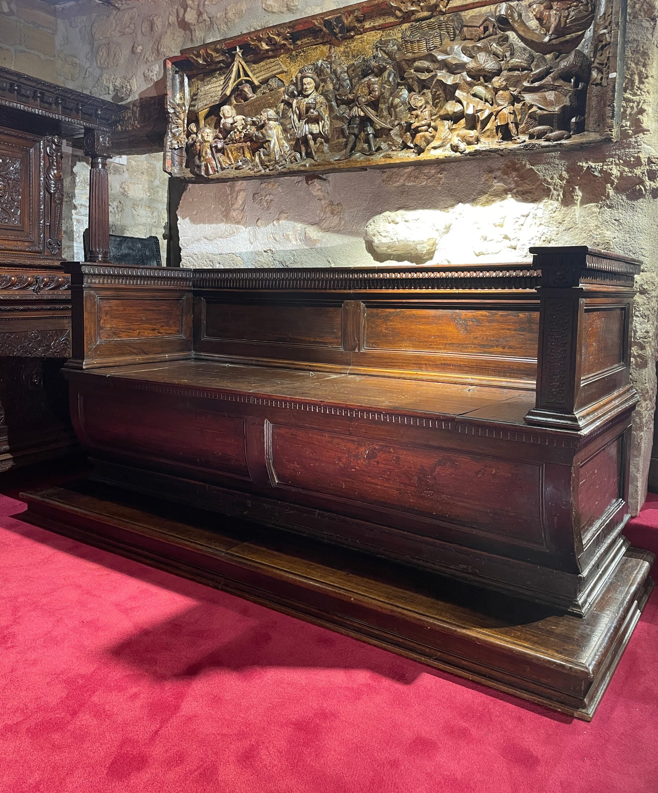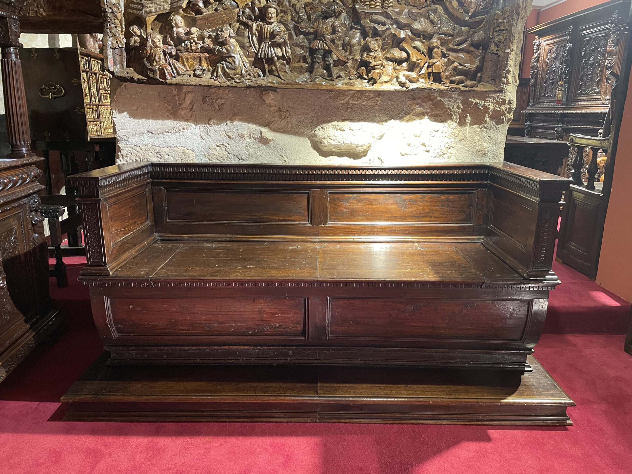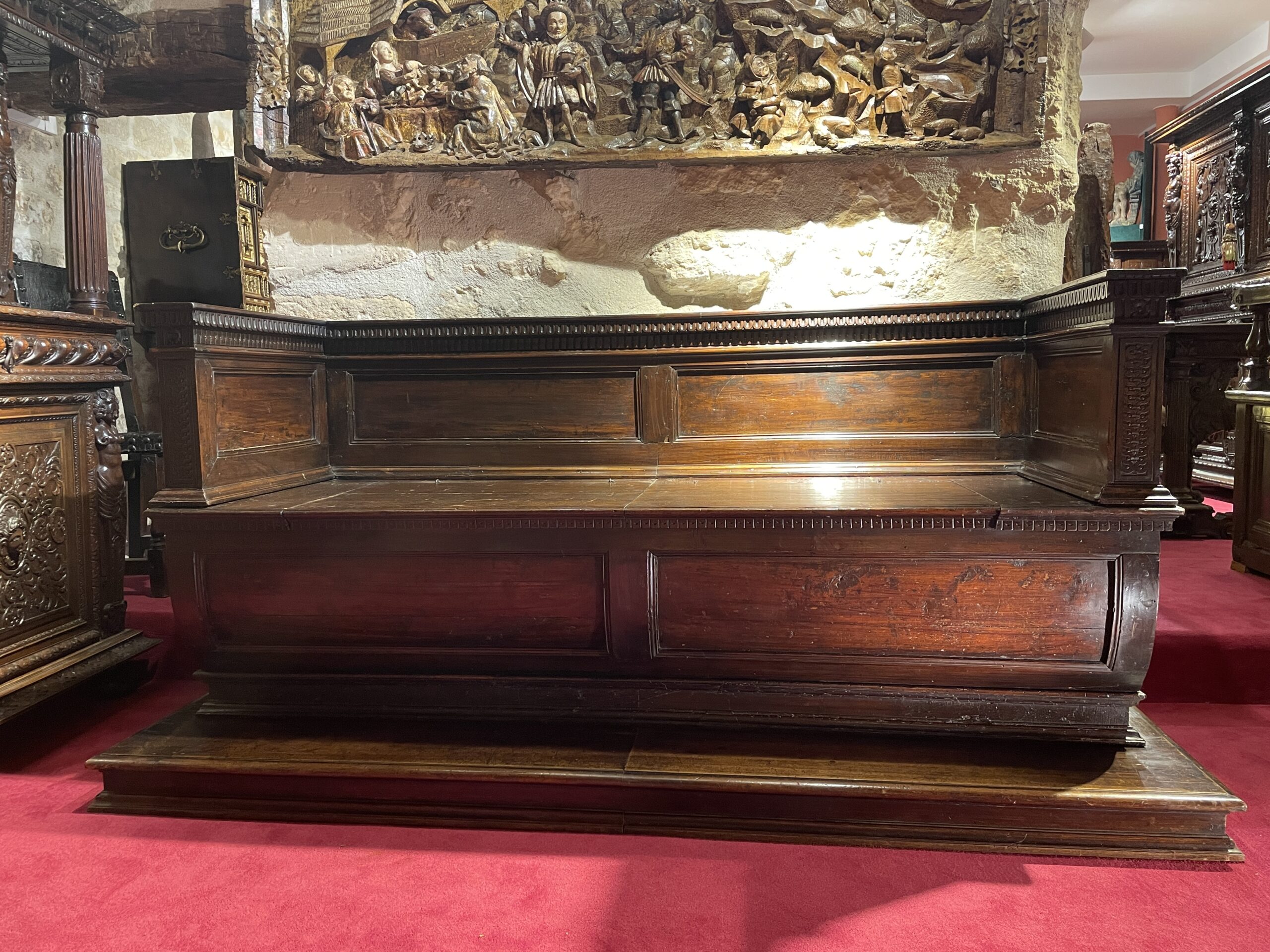 La Cassapanca, littéralement banquette, était alors un coffre à rangement oblong, muni d’un dossier et d’accoudoirs et dont le couvercle, formait assise, souvent profonde comme celle-ci. Il repose sur une plinthe à ressauts pour épouser le plan du meuble.