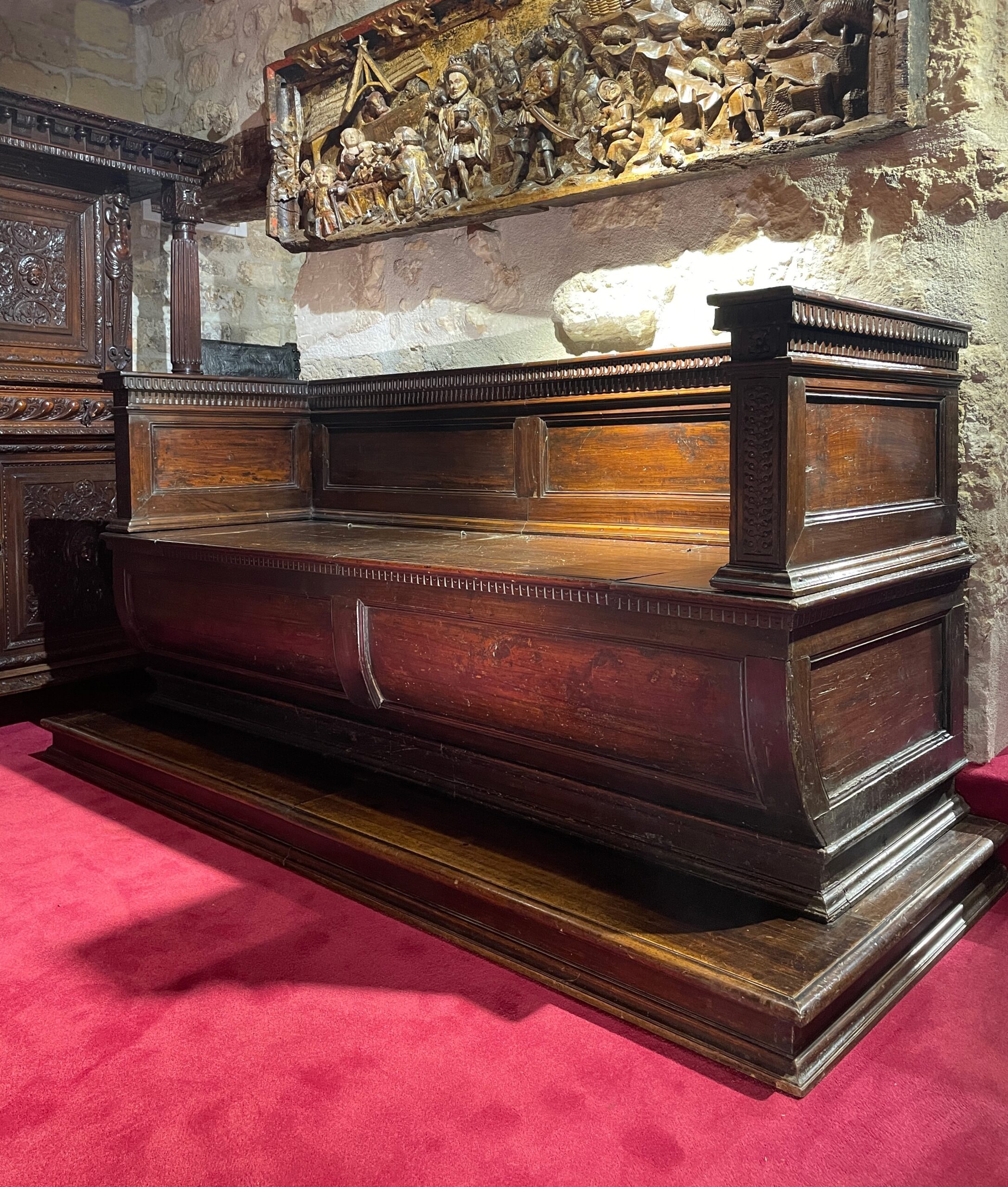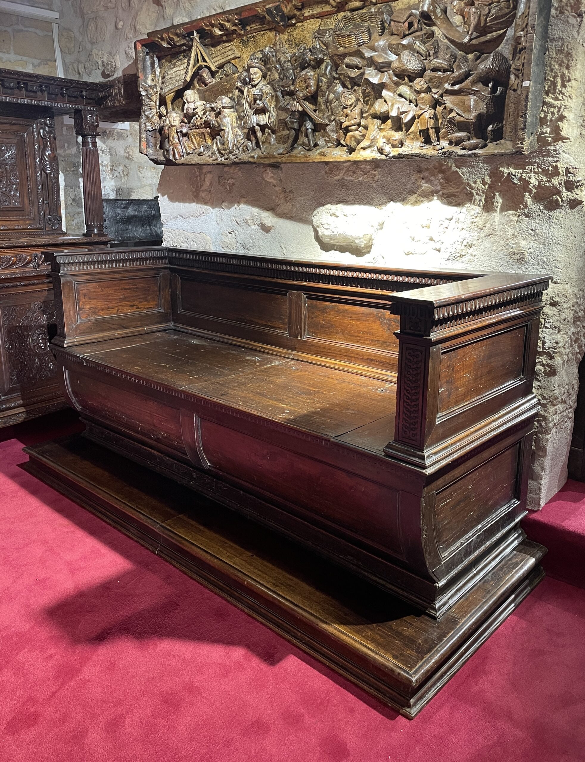 Le dosseret qui revient sur les côtés ainsi que le banc s’ouvrant en deux coffres, sont ornés de larges panneaux moulurés. La partie inférieure offre une forme bombée et surmonte sa base moulurée.