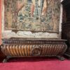 Cette imposante Cassone florentine en noyer sculpté, affecte la forme d’un sarcophage à l’antique. Elle repose sur quatre puissants pieds en forme de griffe de lion.