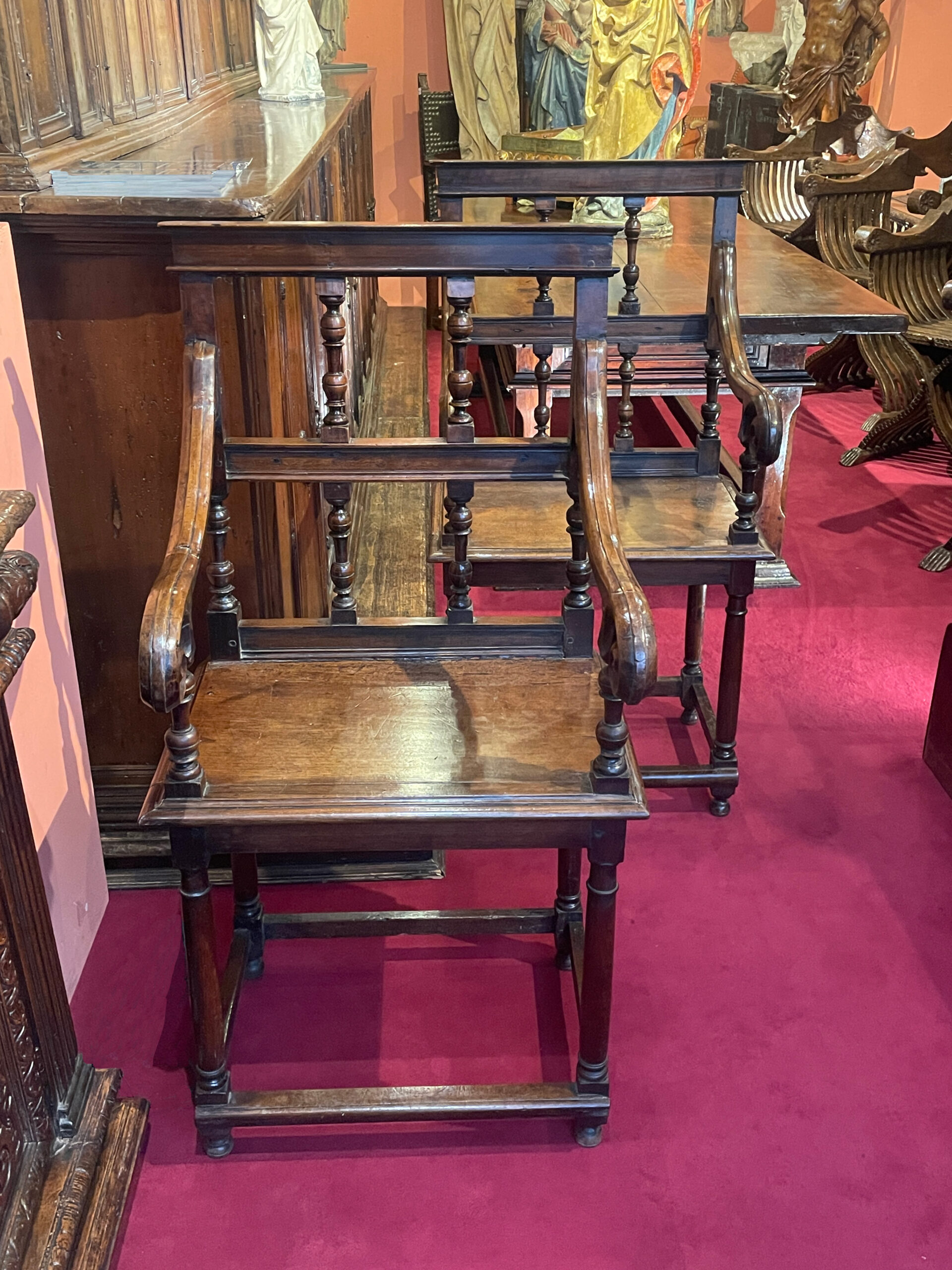 Cette belle Paire de chaises à bras d’apparat d’époque Henri II datant du début de la renaissance, est sculptée dans un bois de noyer à la patine bien conservée.