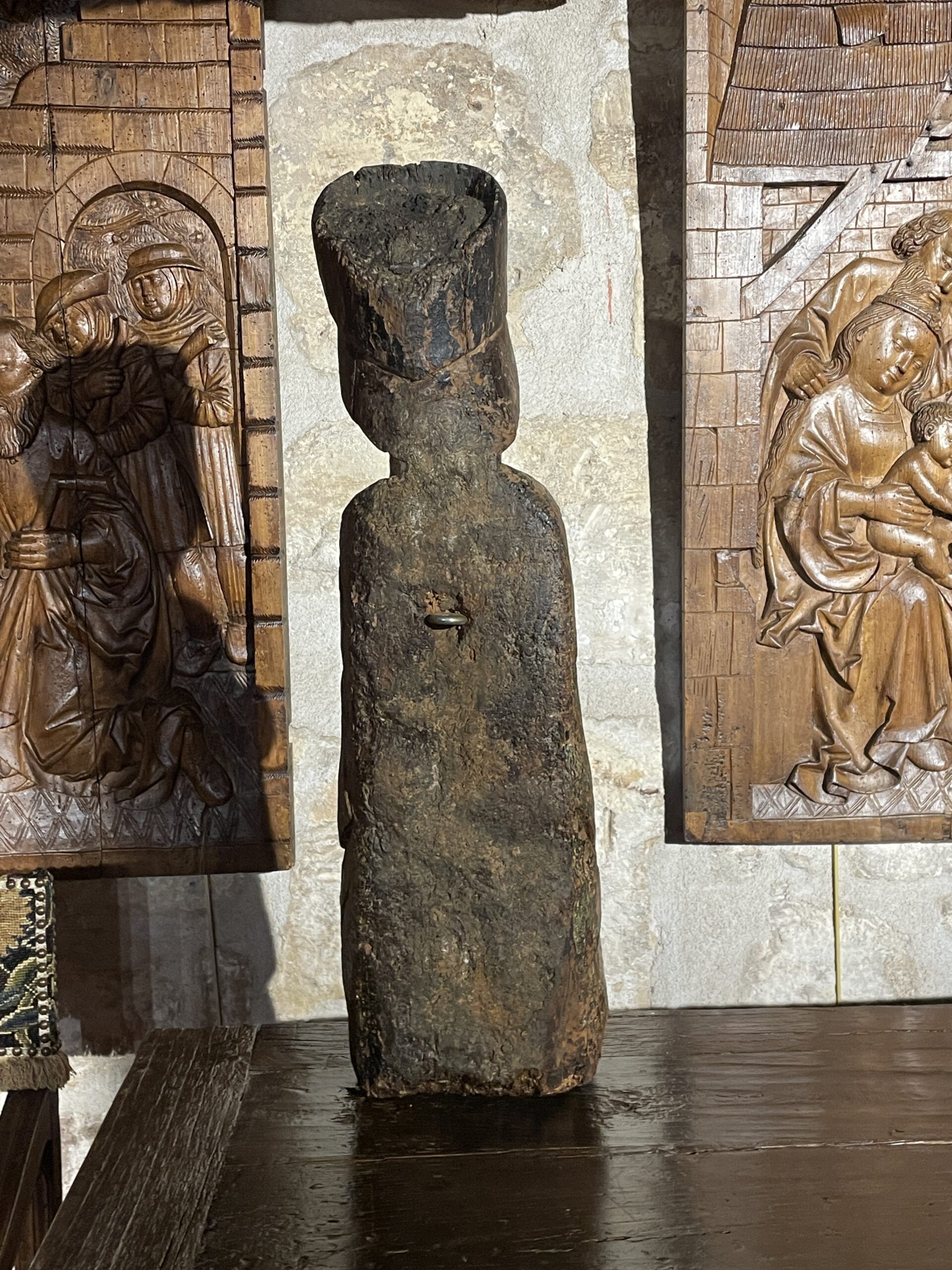 Cette sculpture travaillée en ronde bosse dans un bois de résineux présente un Saint Jacques pèlerin. De stature, hiératique, il est positionné debout. Tôt d’époque, il est sculpté de manière primitive, encore un peu rigide et frontale comme il est d’usage en ce début du XIIIème siècle. Il tient un livre ouvert de sa main gauche. Les traits de son visage jovial semblent bienveillants. Il invite le spectateur à la dévotion. Il porte sa besace de pèlerin en bandoulière et une chape couvre ses épaules.