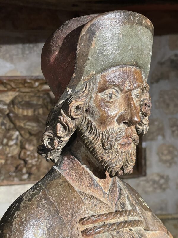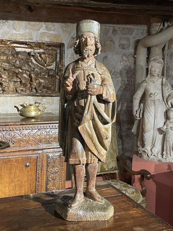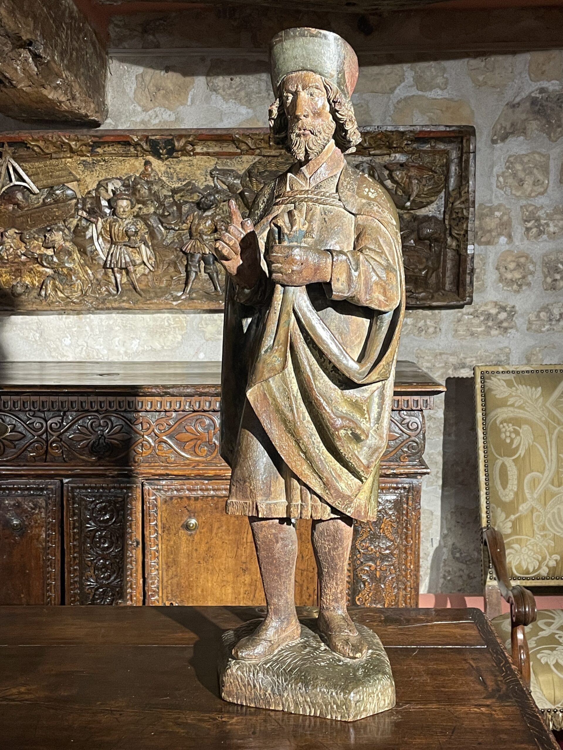 Notre Saint en partie polychromé est sculpté en ronde-bosse. Le dos est évidé.