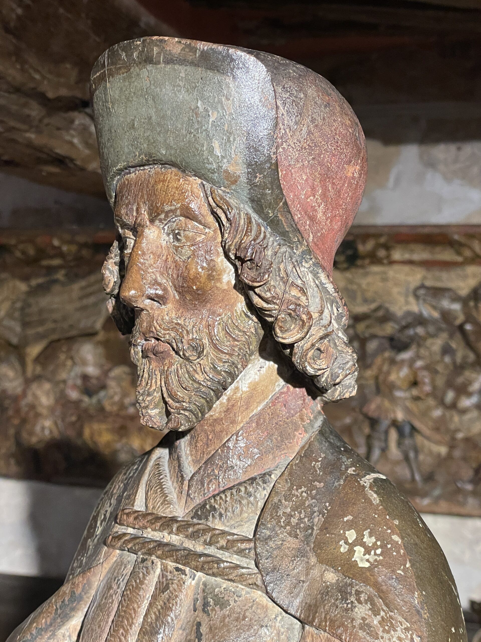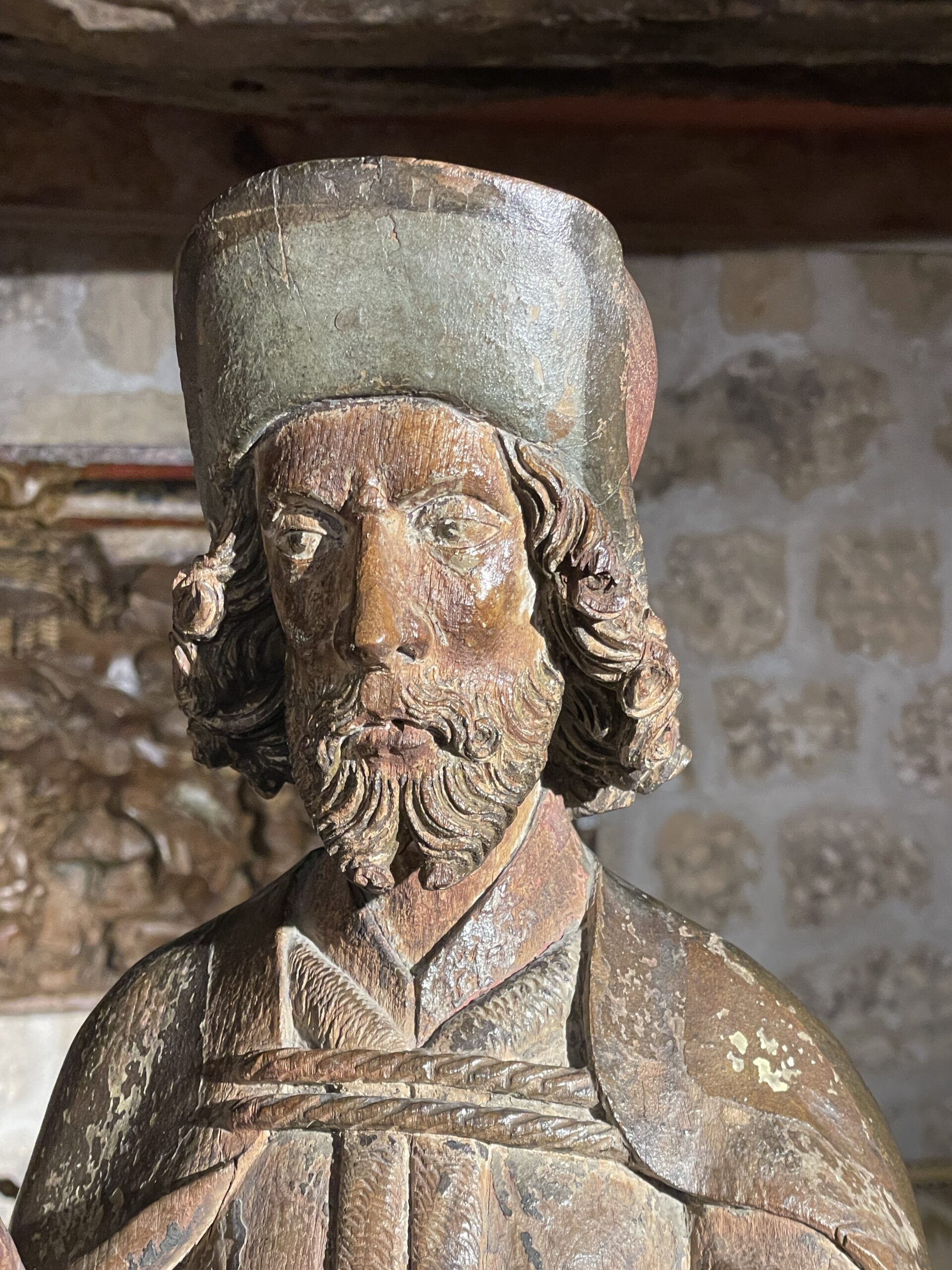 Le saint est représenté sous les traits d’un homme d’âge mûr, d’une rare beauté. Il se distingue par son regard particulièrement perçant. Sa chevelure et sa barbe bifide, coiffées en fines mèches souples, encadrent un visage aux traits vigoureux, au nez bien dessiné, aux pomettes saillantes et aux joues légèrement creusées. Son chapeau rouge à large rebord vert est celui d’un voyageur. La mode vestimentaire de ce saint le situe parfaitement dans son époque avec ses chausses pointues et encore plates. Il porte une tunique courte ceinturée à la taille, brodée de fourrure au col et en partie basse. Celle-ci est recouverte d’un manteau attaché à l’avant par deux cordelettes.