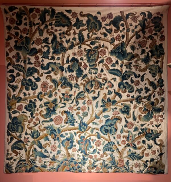 Sur une toile renouvelée, est réappliqué un ensemble de rinceaux de feuilles d’aristoloches brodées de laine. Sur cette broderie extrêmement décorative se fondent différentes teintes de vert et de beige pour les feuilles, brodées au point lancé, ainsi que deux tons de rose pour les fleurs, brodées au point de chainette ; pour le cœur beige des fleurs c’est le point de bourdon qui a été utilisé.
