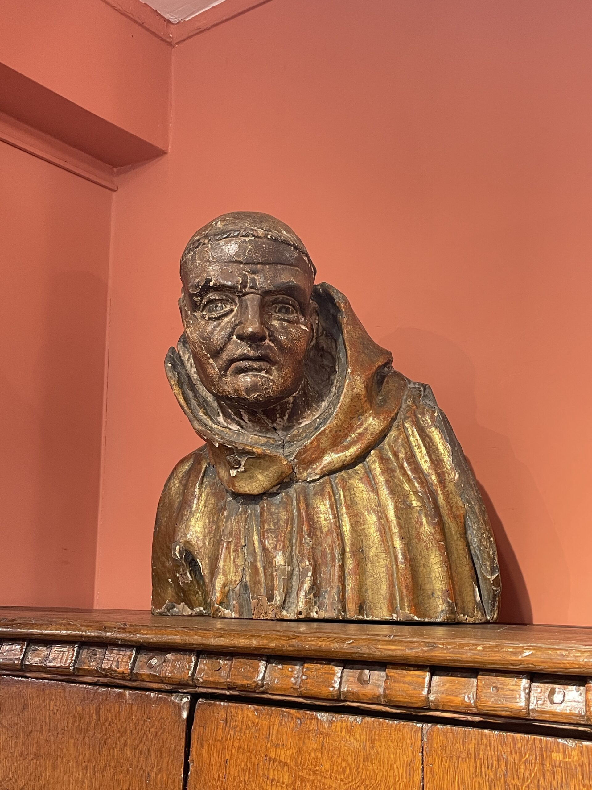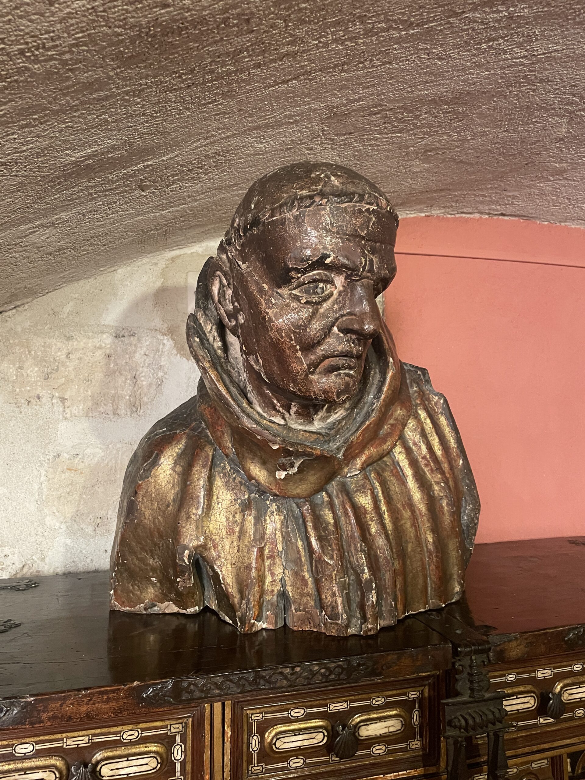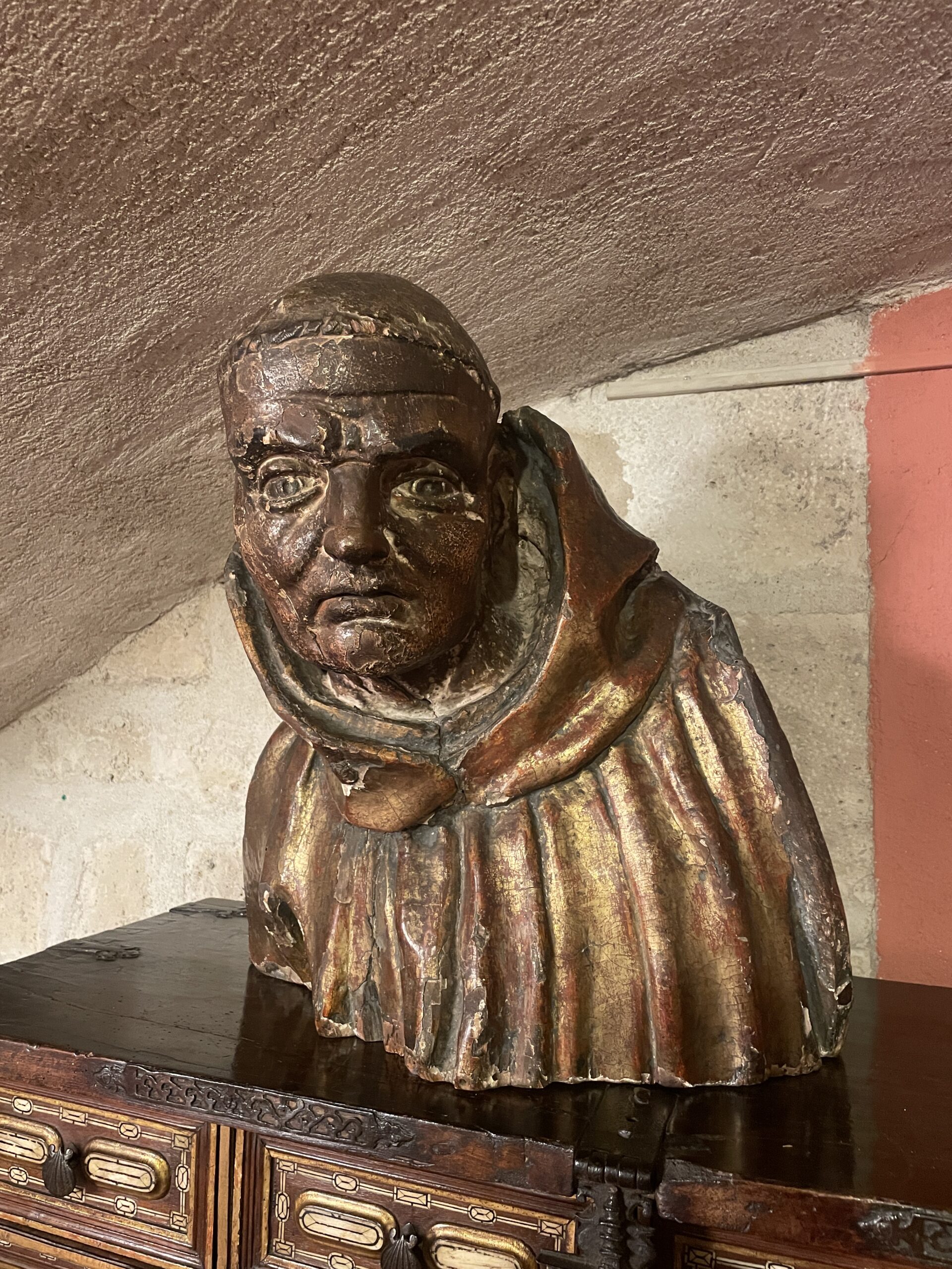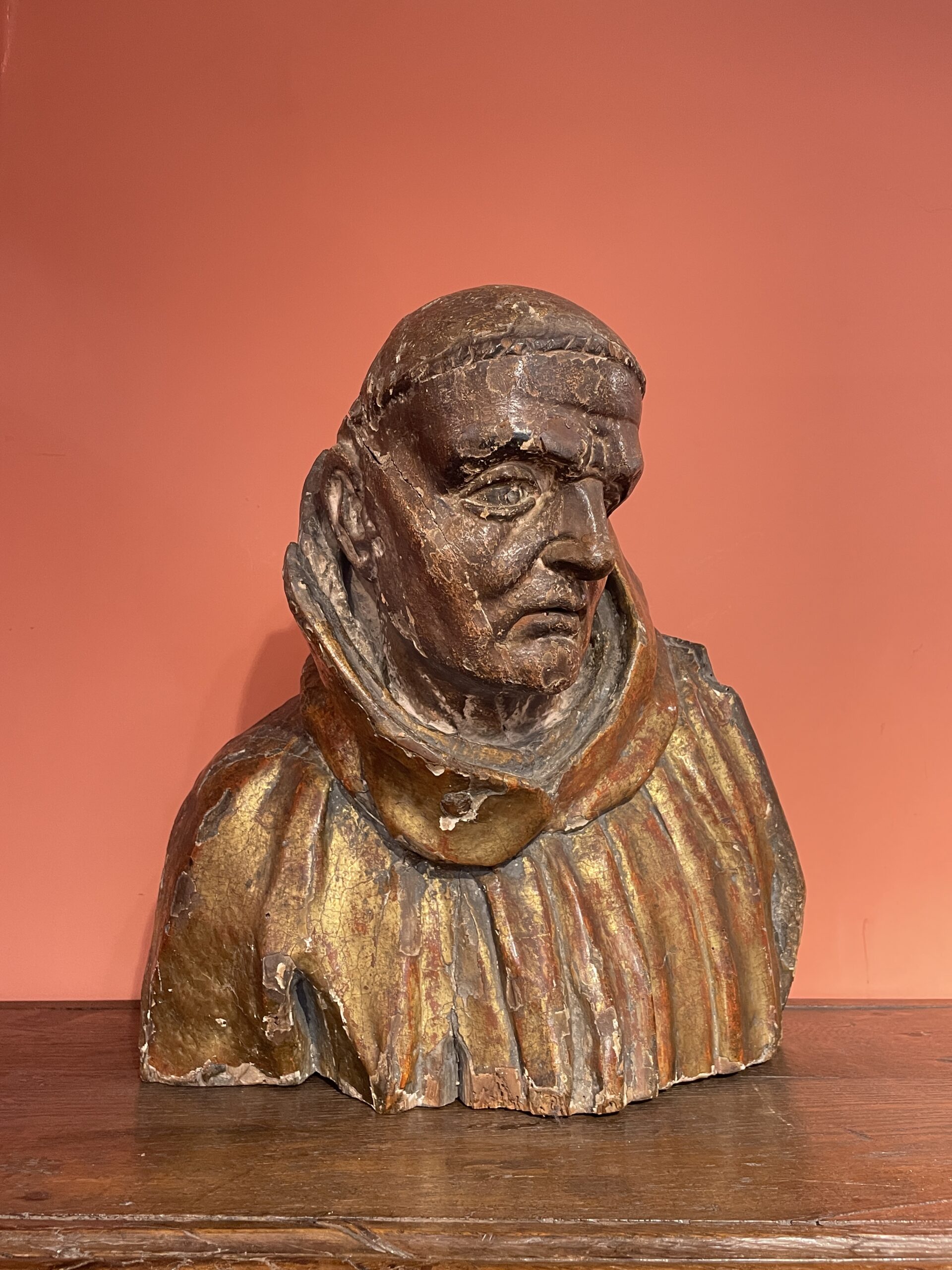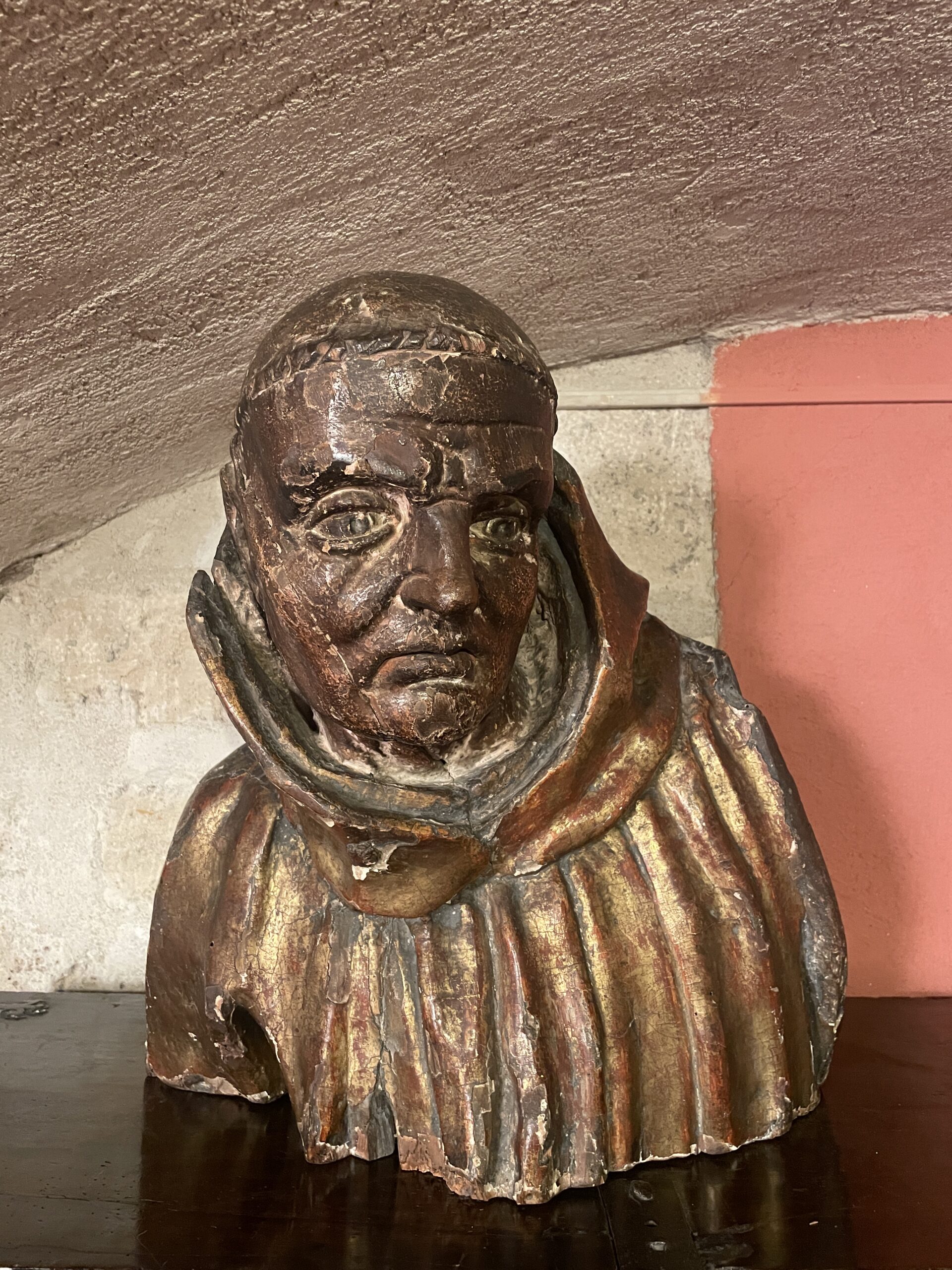 Vêtu de ses habits ecclésiastiques le Moine, avec sa tête légèrement penchée vers l’avant, présente une expression très intériorisée. Les traits de son visage sont marqués, la bouche est charnue et son regard profond. C’est toute l’âme dévouée à Dieu qui transparaît à travers cette sculpture travaillée en ronde-bosse.