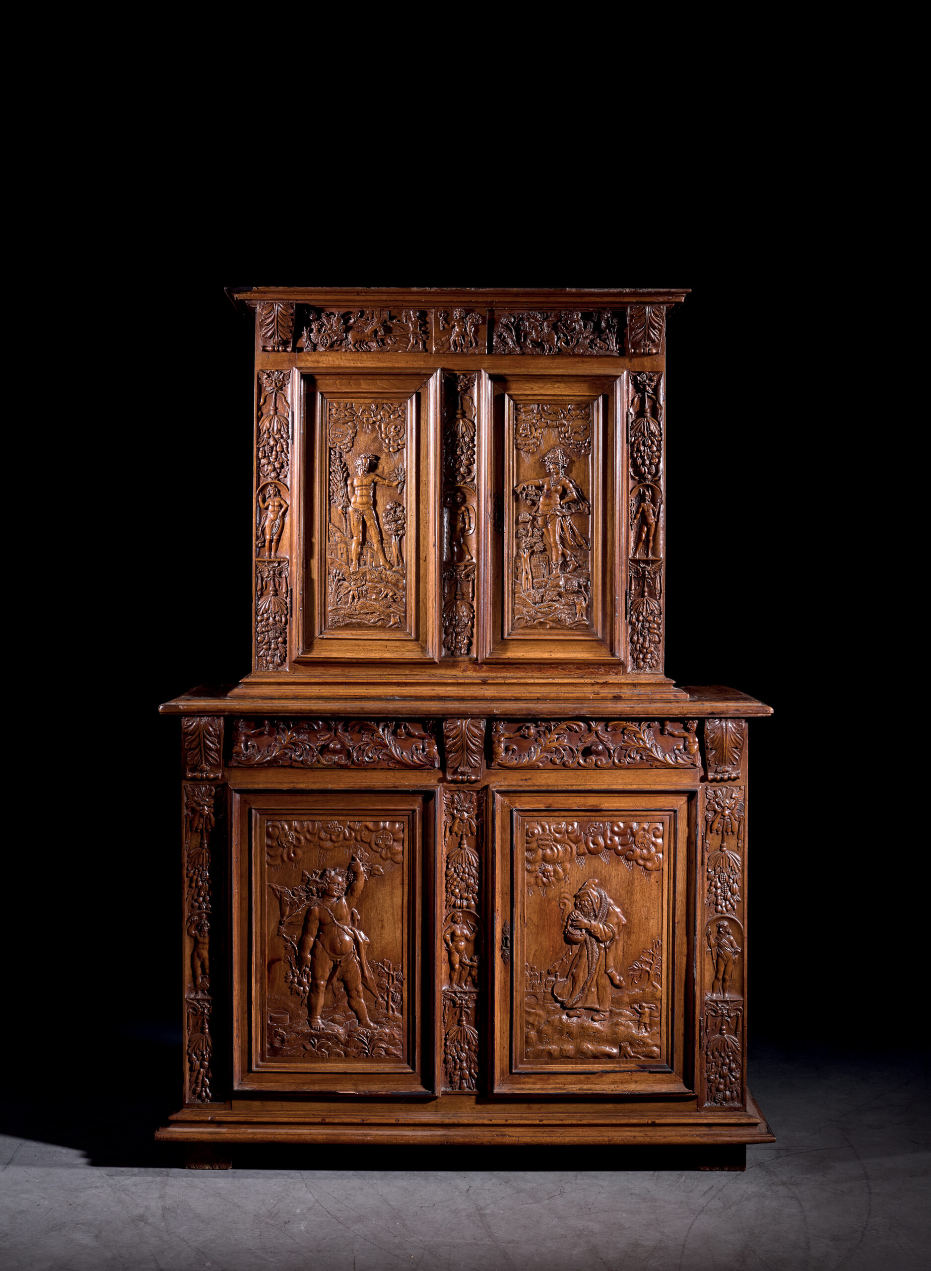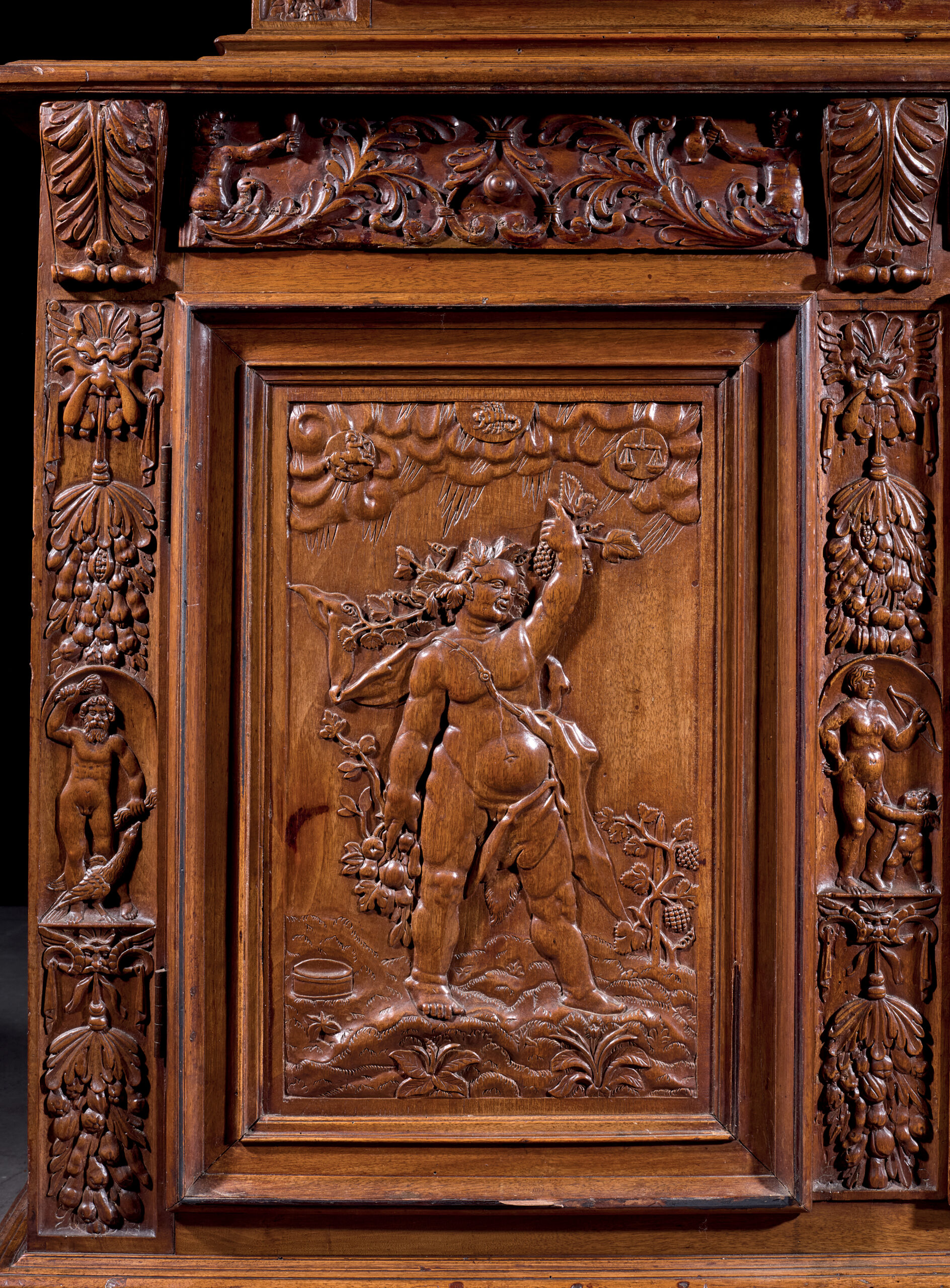 Ce rare Cabinet d’époque Renaissance arbore de riches atours représentant les quatre saisons sur ses vantaux, agrémentés des allégories de l’abondance et de la prospérité, ainsi que de figures mythologiques. Il est d’une belle architecture, où se côtoient de riches ornements.