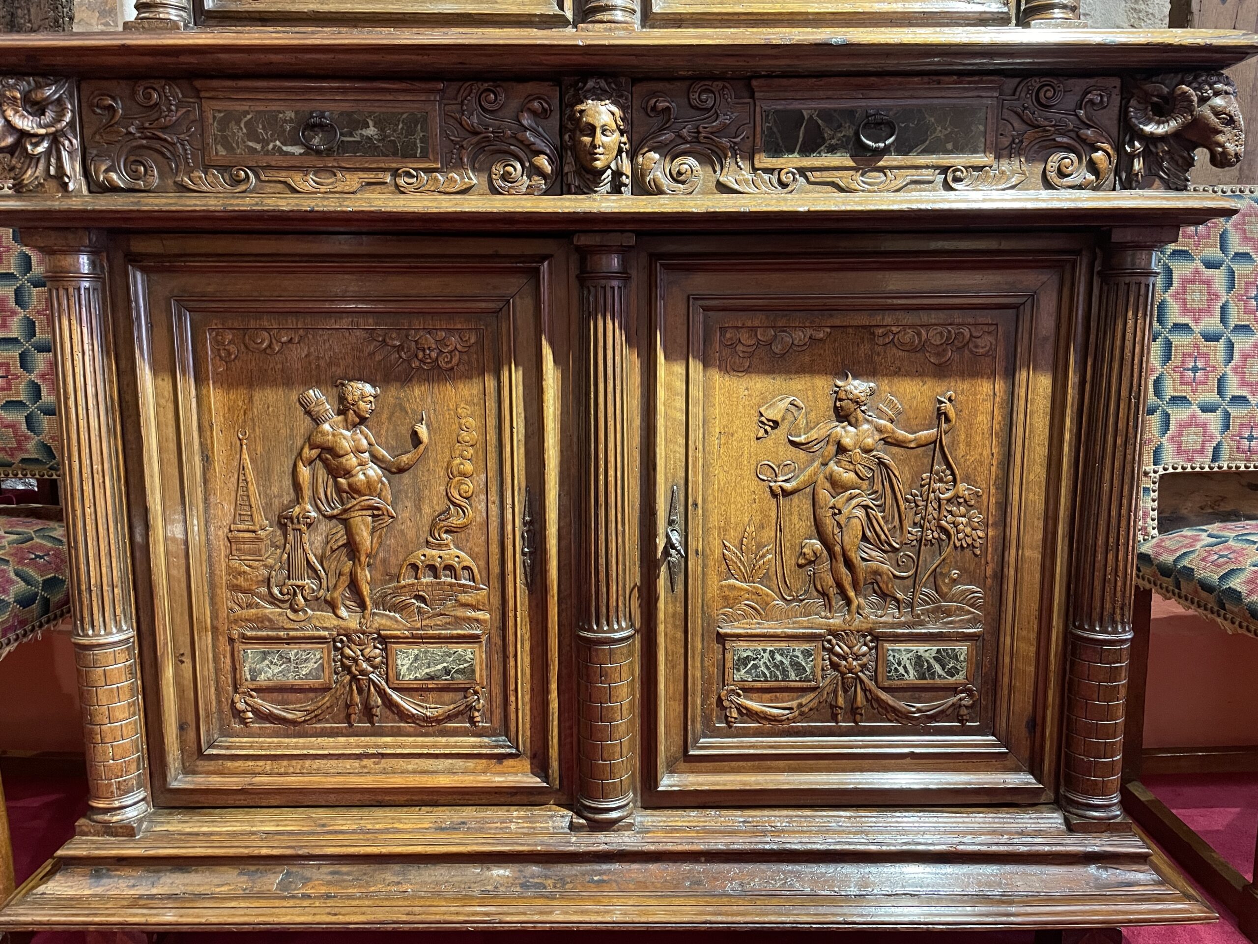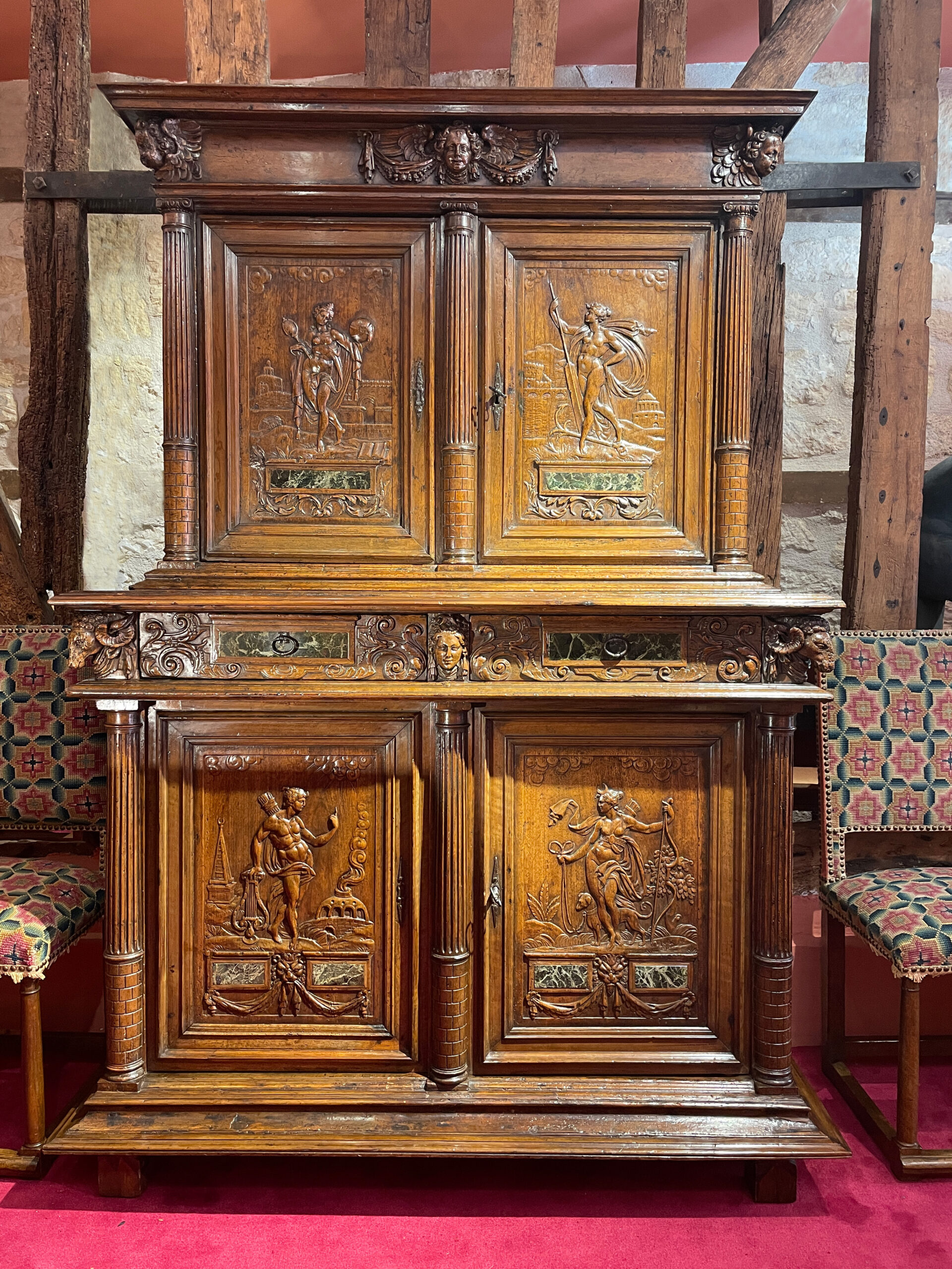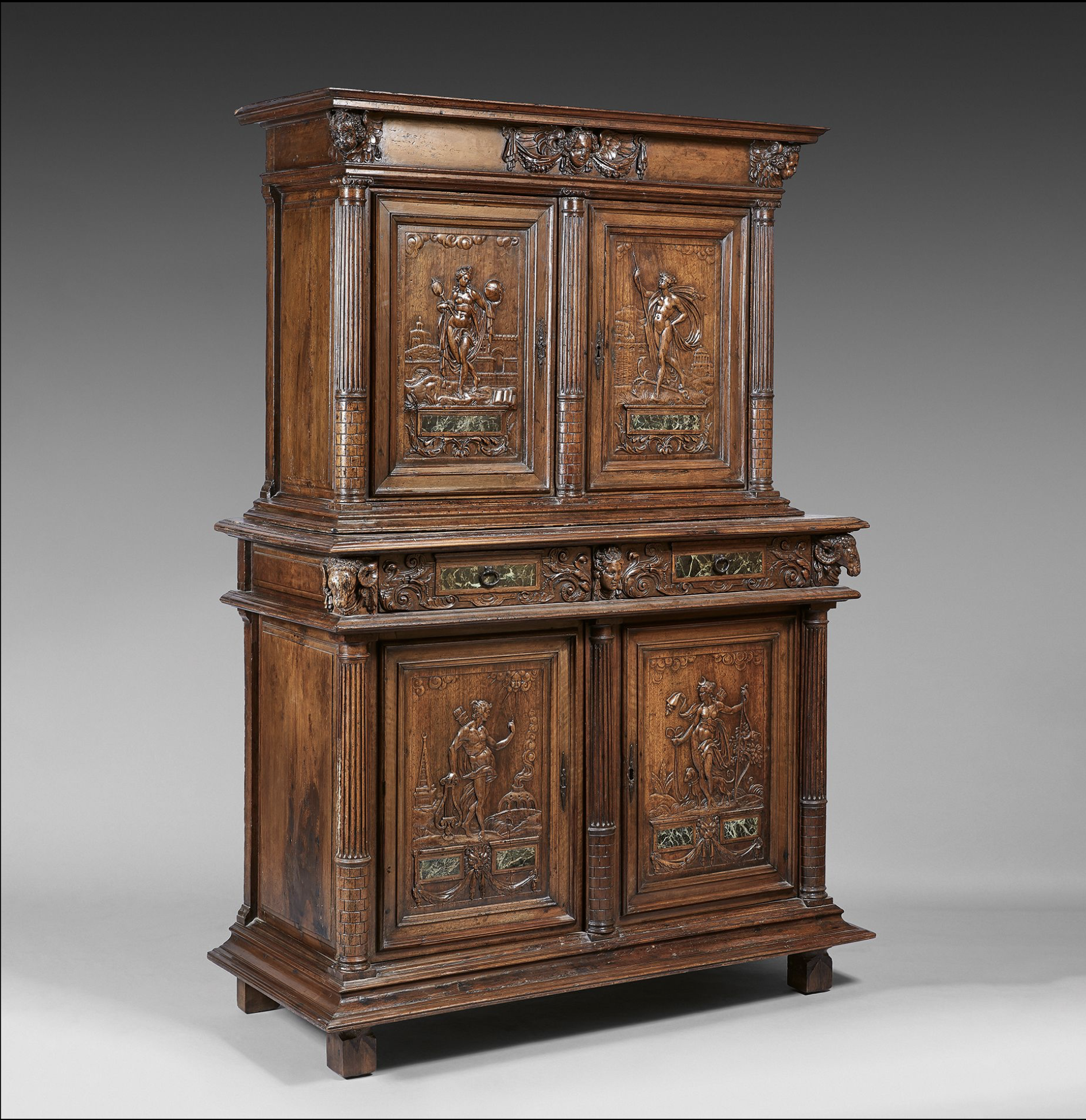 Le travail de sculpture, la justesse de la composition et le respect des proportions font de ce meuble architecturé, un parfait exemple du mobilier de la Renaissance Bellifontaine.