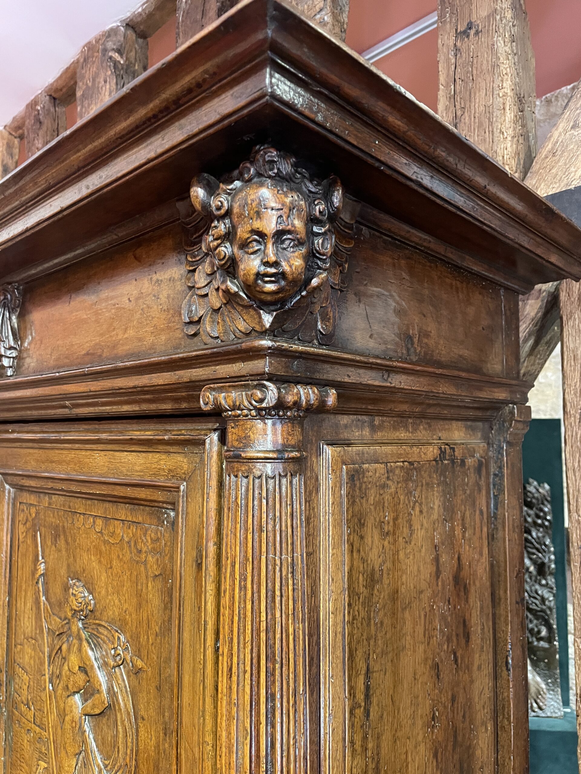 Un entablement couronne le Cabinet avec au centre une belle figure féminine ailée à l’allure angélique, dont le front est orné d’une fibule, au sein d’une guirlande drapée typiquement renaissante.