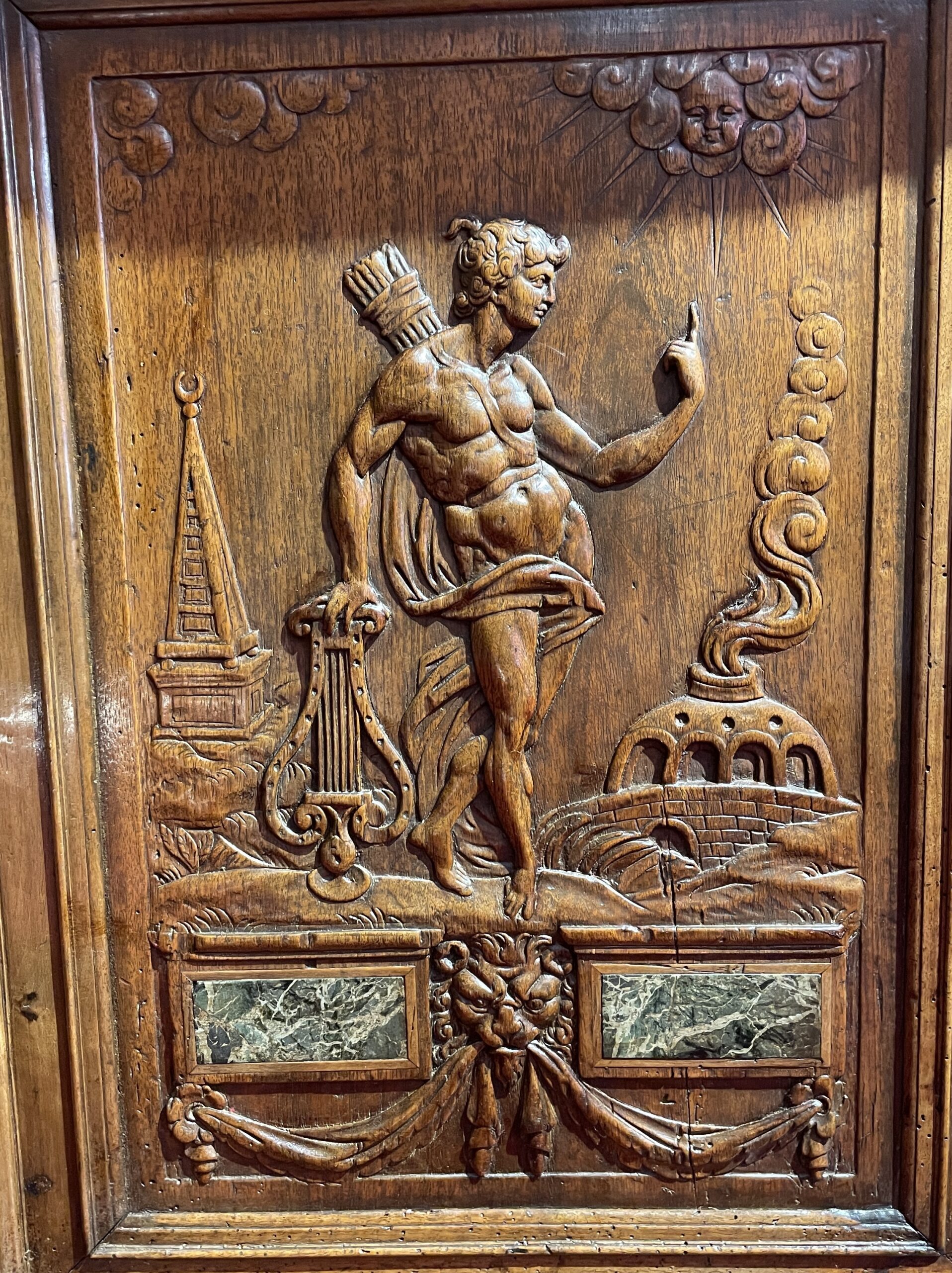 Sur le vantail de gauche, Apollon, le Dieu des Arts, du chant et de la musique, de la poésie et de la lumière, est présenté avec ses attributs.