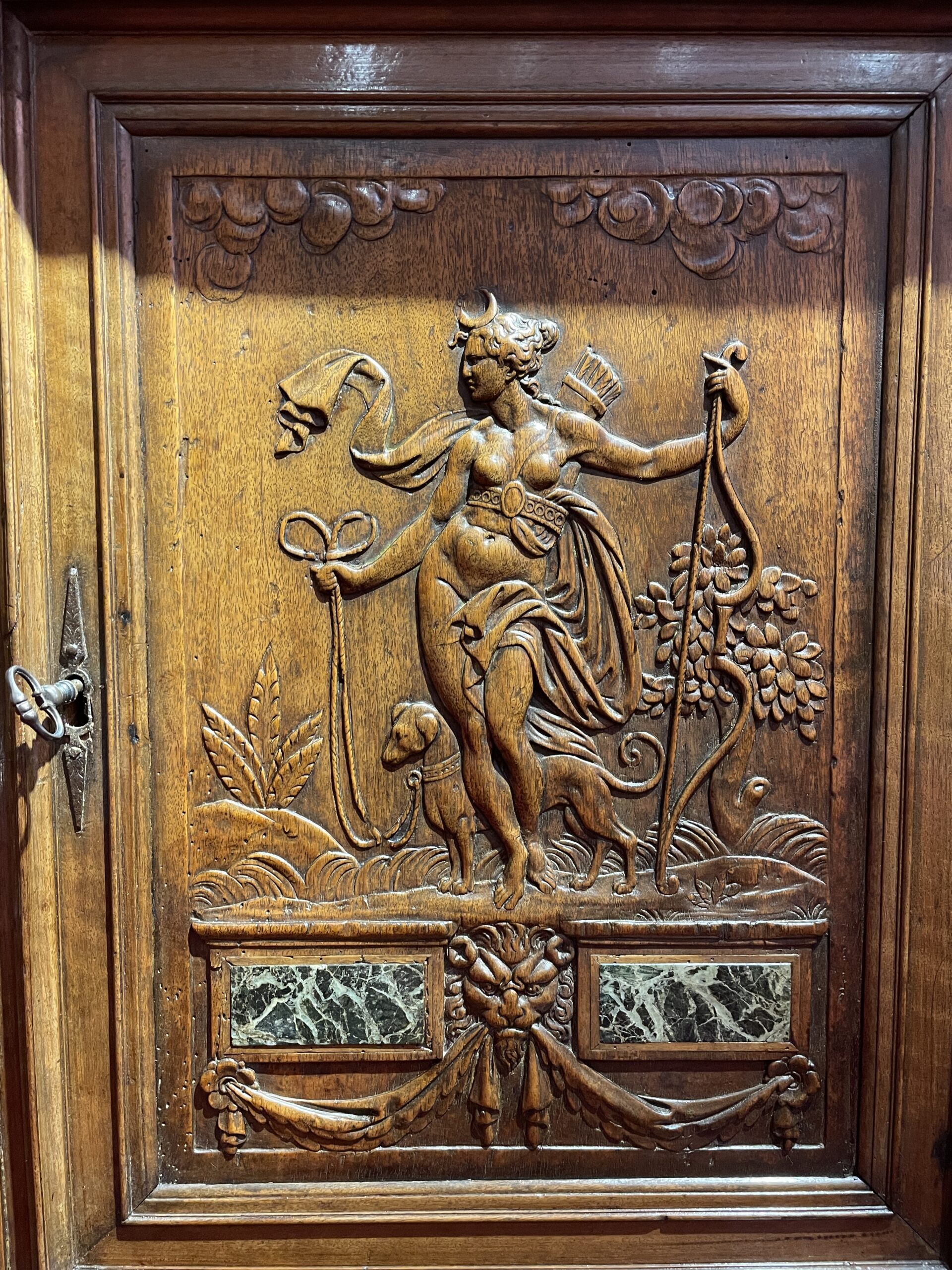 Ce Cabinet à deux corps en léger retrait est réalisé dans un beau bois de noyer. Il présente sur ses quatre vantaux des figues mythologiques qui ensemble évoquent un thème bien connu de la mythologie : La Jalousie d’Héra envers Léto, qui dut prendre la mer et jeter l’ancre sur une île pour faire naître Apollon et Artémis.