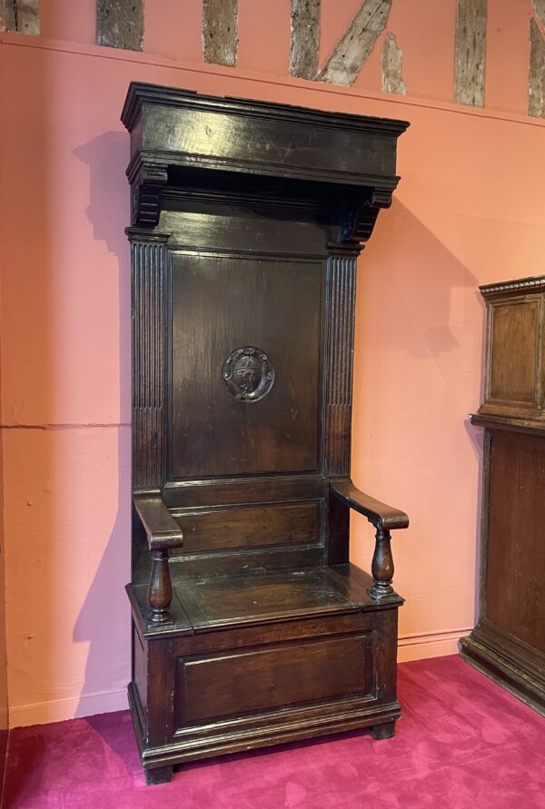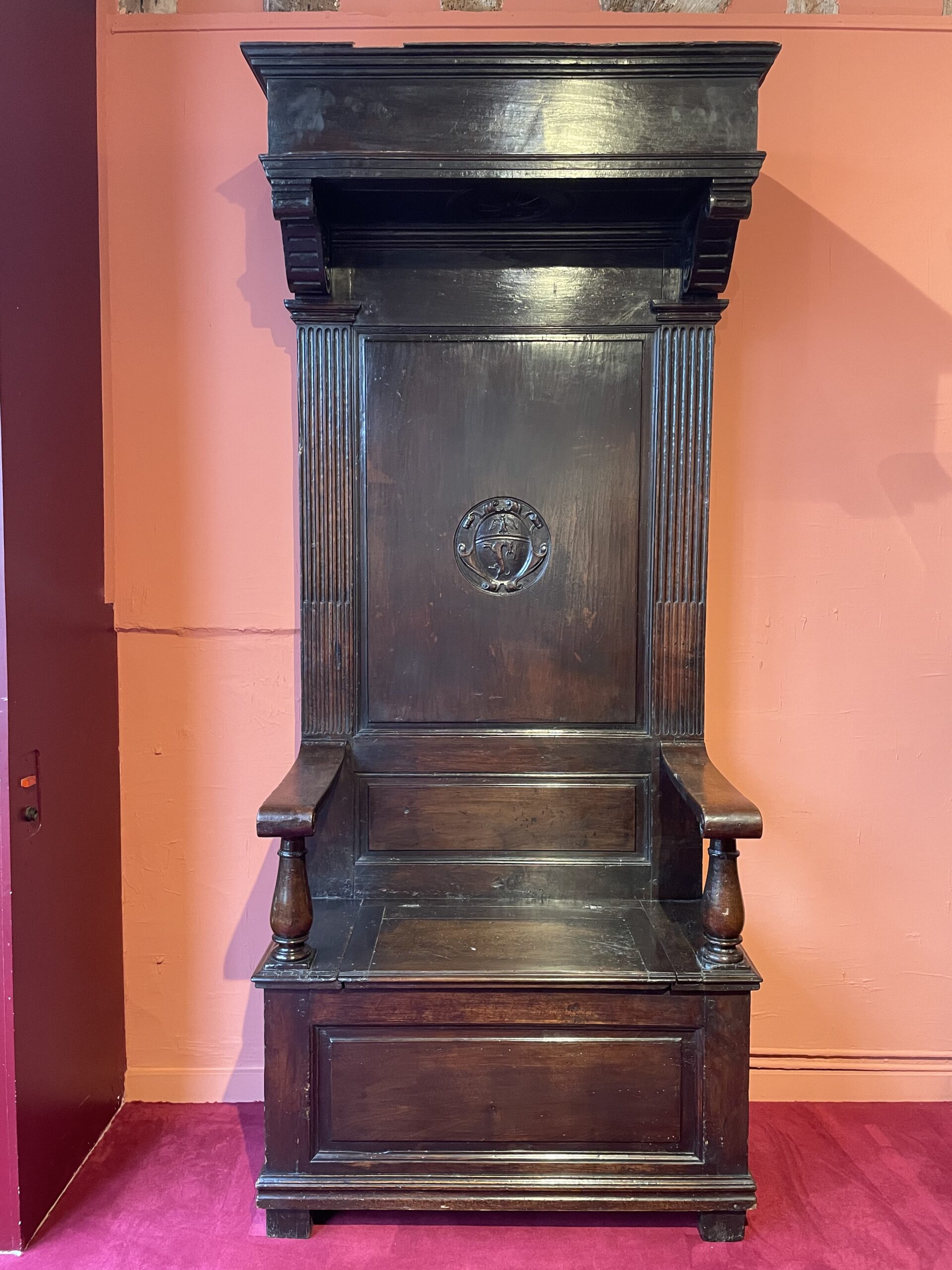 Cette cathèdre ou chayère est conçue selon les règles de l’architecture monumentale. Elle se compose d’un coffre ouvrant par un abattant qui forme l’assise. Les deux accotoirs légèrement incurvés sont soutenus par un balustre. Le grand dossier est encadré de deux pilastres cannelés.