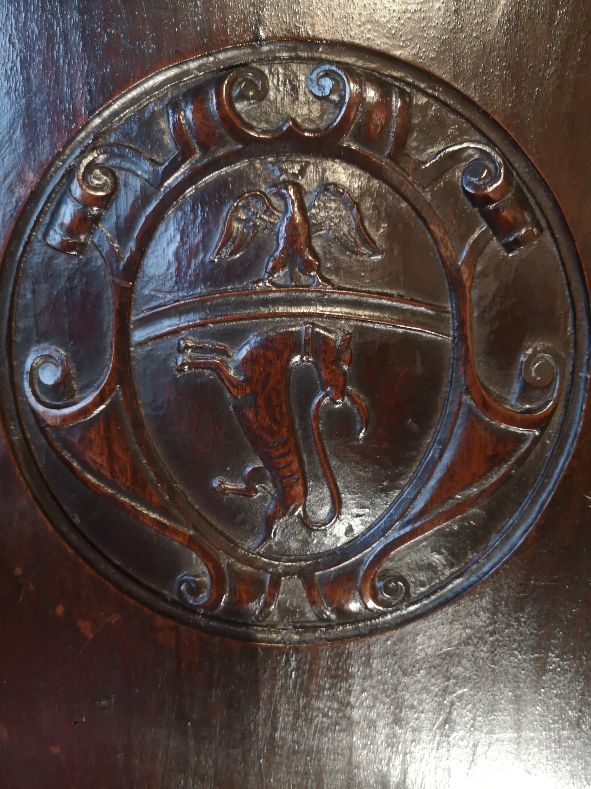 En son centre un écusson se détache sur un cuir découpé, représentant un lévrier se mordant la queue et un aigle impérial.
