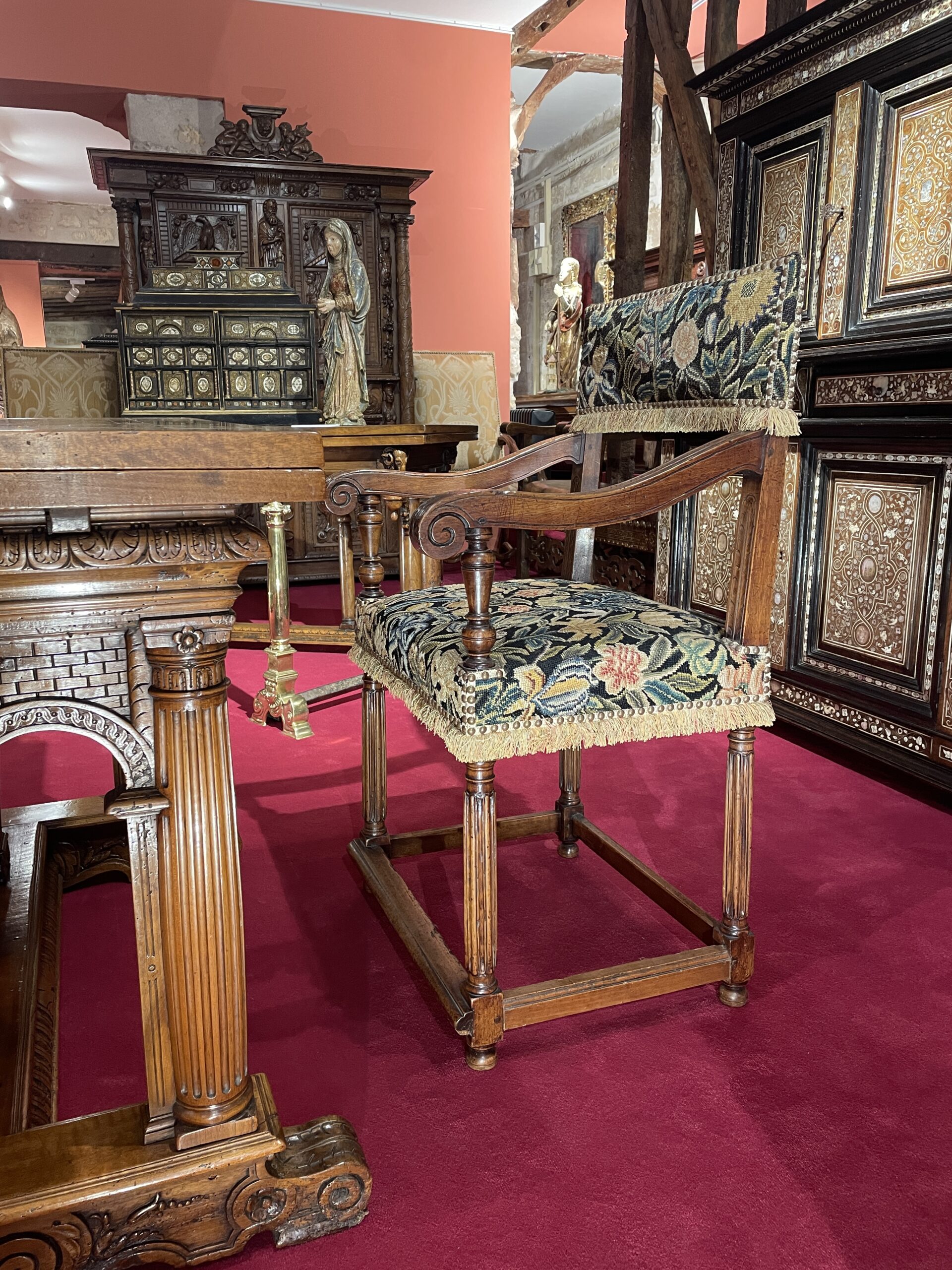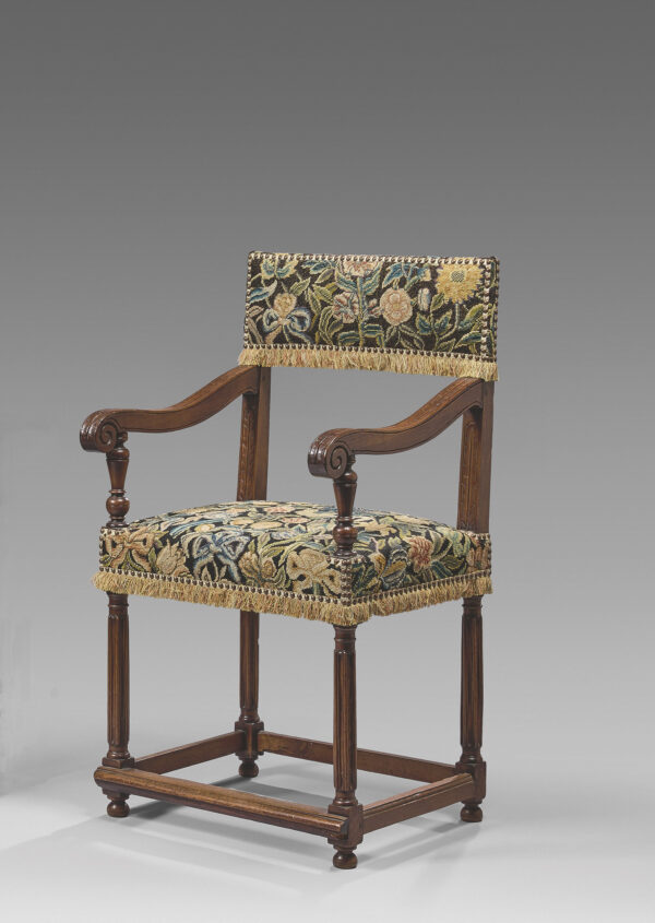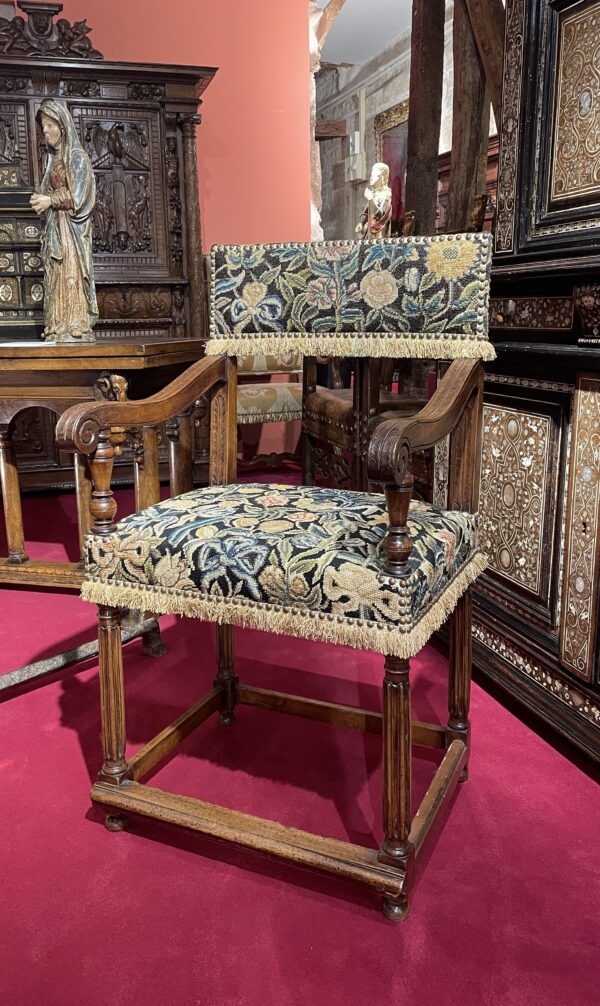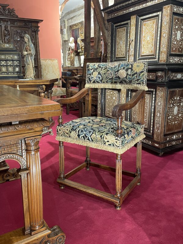 Cette rare Chaise à bras d’époque Henri II est habillée d’une belle tapisserie au petit point à motif floral et végétal sur le dosseret ainsi que sur l’assise.